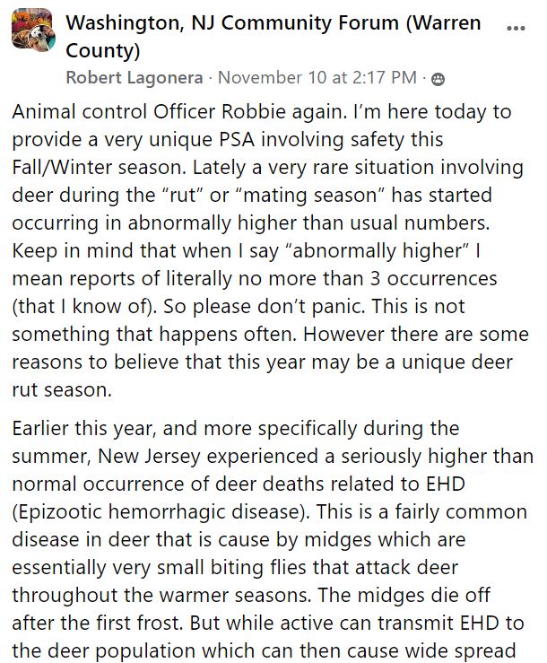 AMBER LOVE 12-NOV-2021 On Facebook, our local Animal Control Officer (ACO Robbie) posted a detailed explanation of what’s going on in the region’s white-tailed deer population. As I read it, I was afraid he would say SARS-COV2 or Chronic Wasting Disease (CWD) was a bigger concern than normal, but it was something completely different. I copied and pasted his text and provided screen caps of his post to the public: