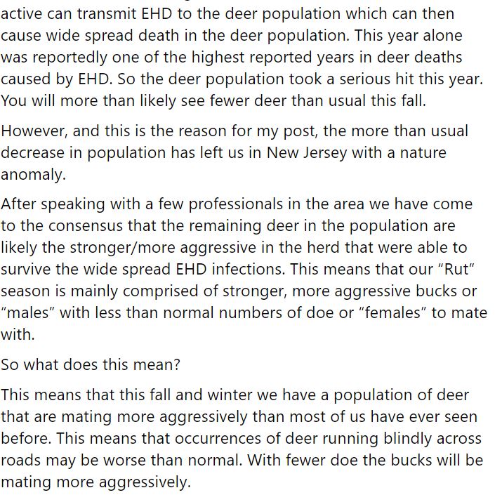 Earlier this year, and more specifically during the summer, New Jersey experienced a seriously higher than normal occurrence of deer deaths related to EHD (Epizootic hemorrhagic disease). This is a fairly common disease in deer that is cause by midges which are essentially very small biting flies that attack deer throughout the warmer seasons. The midges die off after the first frost. But while active can transmit EHD to the deer population which can then cause wide spread death in the deer population. This year alone was reportedly one of the highest reported years in deer deaths caused by EHD. So the deer population took a serious hit this year. You will more than likely see fewer deer than usual this fall.