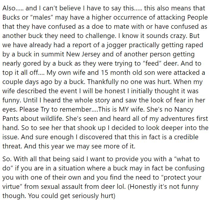 Also.. and I can’t believe I have to say this.. this also means that Bucks or “males” may have a higher occurrence of attacking People that they have confused as a doe to mate with or have confused as another buck they need to challenge. I know it sounds crazy. But we have already had a report of a jogger practically getting raped by a buck in summit New Jersey and of another person getting nearly gored by a buck as they were trying to “feed” deer. And to top it all off, My own wife and 15 month old son were attacked a couple days ago by a buck. Thankfully no one was hurt. When my wife described the event I will be honest I initially thought it was funny. Until I heard the whole story and saw the look of fear in her eyes. Please Try to remember! This is MY wife. She’s no Nancy Pants about wildlife. She’s seen and heard all of my adventures first hand. So to see her that shook up I decided to look deeper into the issue. And sure enough I discovered that this in fact is a credible threat. And this year we may see more of it.