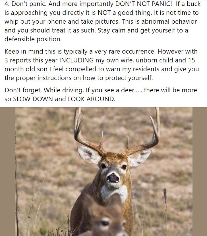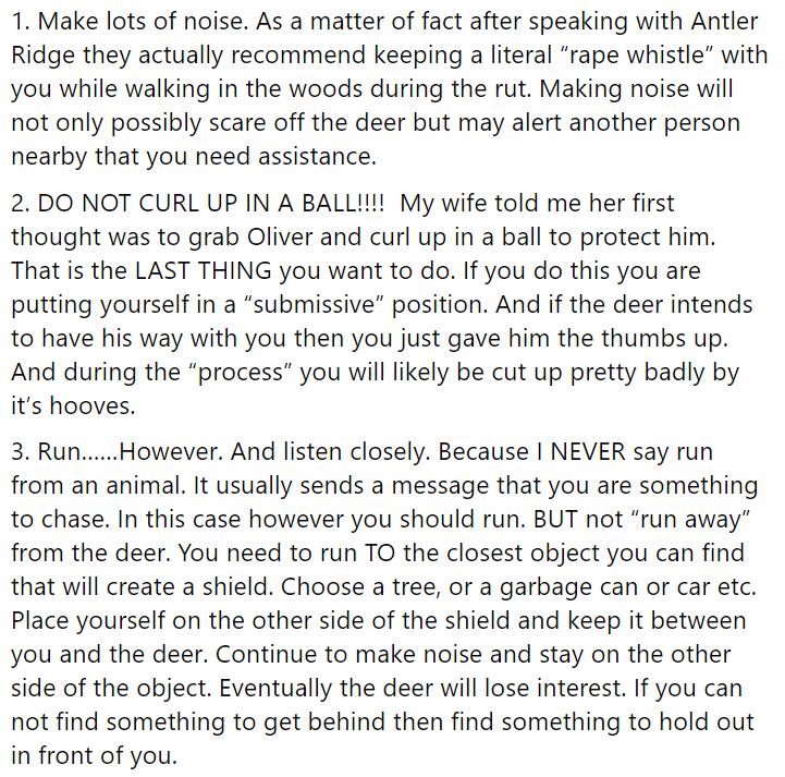 2. DO NOT CURL UP IN A BALL!!!! My wife told me her first thought was to grab Oliver and curl up in a ball to protect him. That is the LAST THING you want to do. If you do this you are putting yourself in a “submissive” position. And if the deer intends to have his way with you then you just gave him the thumbs up. And during the “process” you will likely be cut up pretty badly by it’s hooves.