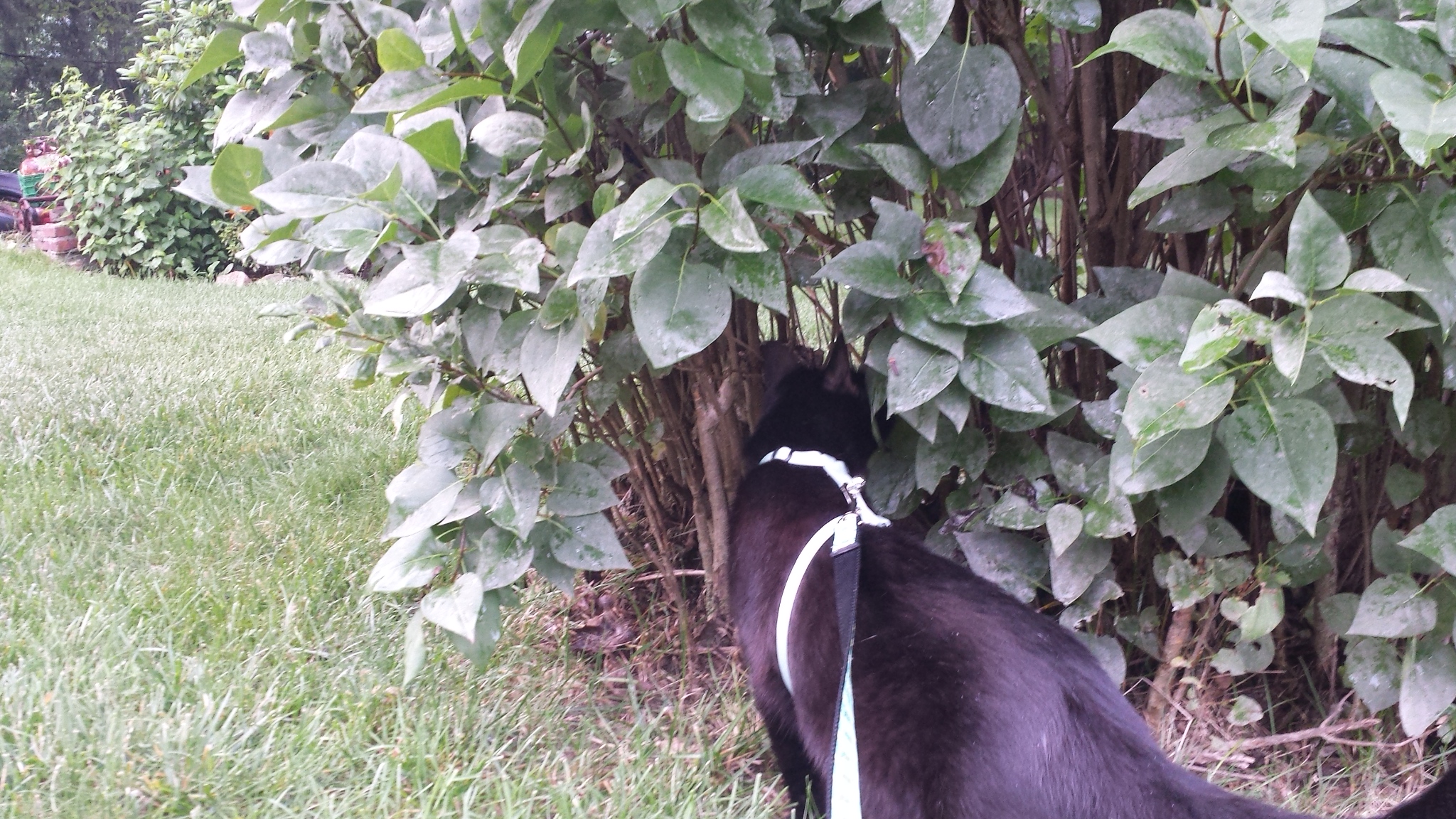 He lead the way to the central garden’s lilac bush. I know birds nest inside the bushes, but given Gus’ track record with only having caught two mice so far (which I was kind of thought Ollie did and Gus was stealing the credit), I didn’t expect Gus to have much chance with birds. He was obsessed with the finches while they lived on the second floor and rented space from the agency headquarters, but he was never allowed to touch them. Plus, when Gus is on his leash, he’s wearing a jingle bell and tethered to a large human with no ninja skills.