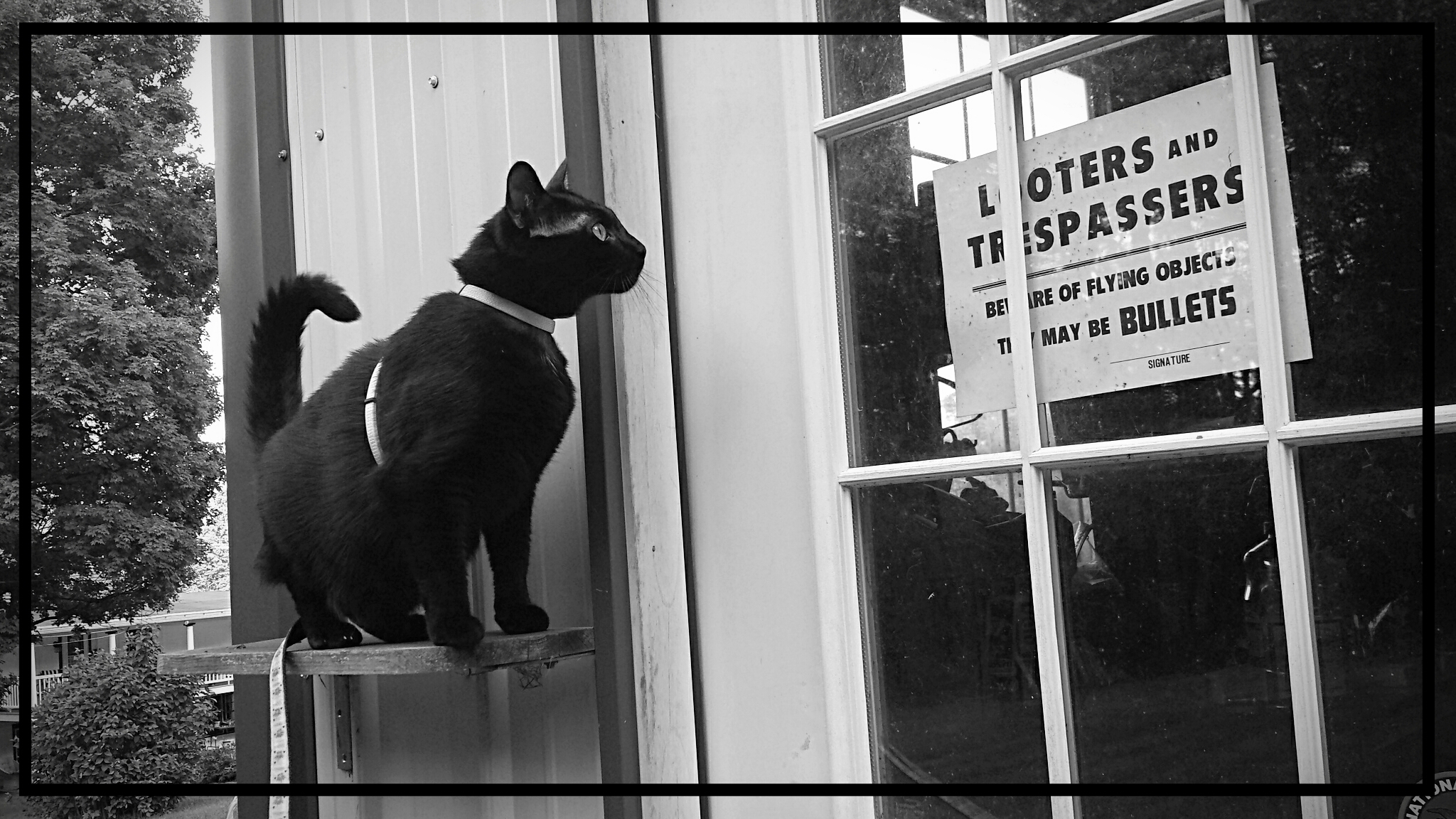 Gus on a shelf on the outside of the garage reading the sign on the door.