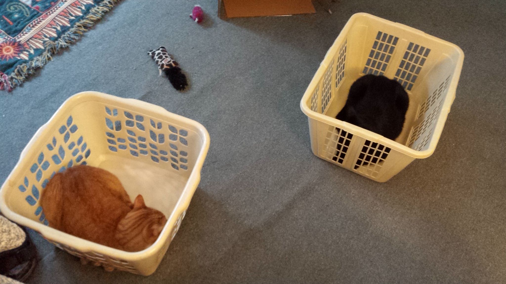 Ollie and Gus in laundry baskets