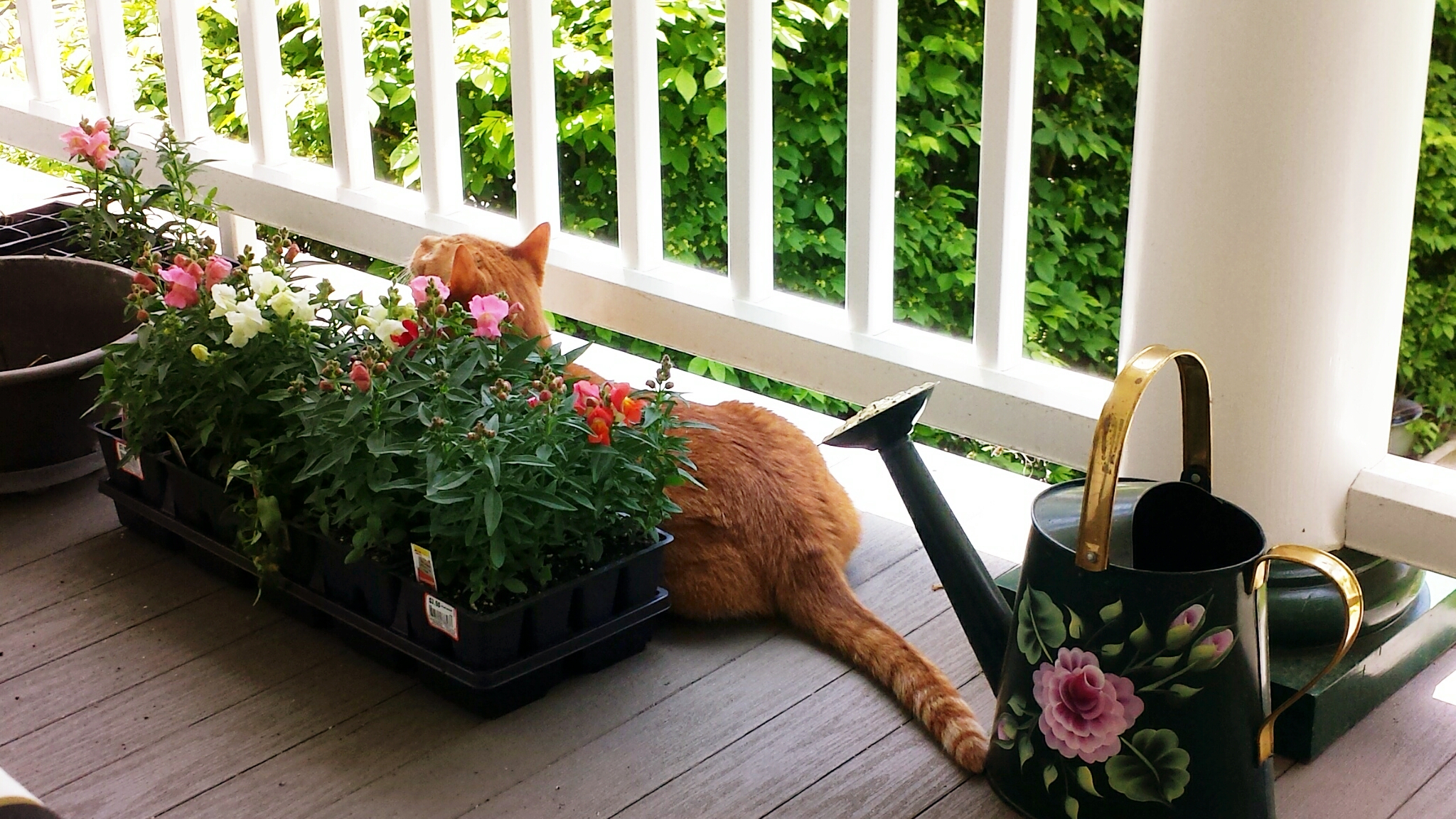 I tried to make this area more welcoming and provide a little of the greater outdoors for the cats and the humans. The first thing planted was the cat grass in pots and in the long flower box. Then we got a large bounty of snapdragons so the cat grass was condensed to the pots where the cats could reach them and the snapdragons were put in the flower box, two hanging baskets (most notably the one chosen by the finches for nesting), and a pot. Ollie is particularly fond of making a good salad out of the snapdragons.