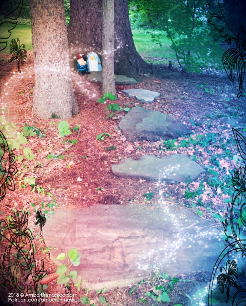As the weather warmed up, Gnomez was moved to the second floor observation deck. There, he helped tend to the potted plants and kept watch over the property whenever Oliver was inside. The weather eventually seemed more stable with predictable spring rains and only occasional huge storms with gusting winds. Near the end of May, Gnomez was given the chance to check out different locations in the grove before he finally settled on a spot at the largest tree. The neighborhood developed a little bit more with some branch pruning, weed pulling, and a slate path installed. The neighborhood was renamed from simply The Grove to Gnome Grove and it’s only a short distance from the Fairies’ House.