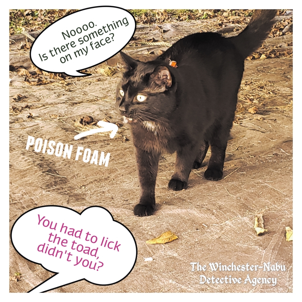 So these creatures do have the same effect as whatever the cats and I have discovered. Given their “taste tests” we have multiple eyewitness accounts of the cats foaming at the mouth. As far as other reactions: Oliver choked up his toad, but Gus merely walked away from his. We kept a close watch on Oliver that day, but I was less worried about Gus since this was our second not-so-clinical trial of Toad tasting. Gus let the creature go and then he walked over to me as if nothing was wrong — as if he didn’t have a mouth and face covered in white foam looking like he was dunked in a cappuccino.