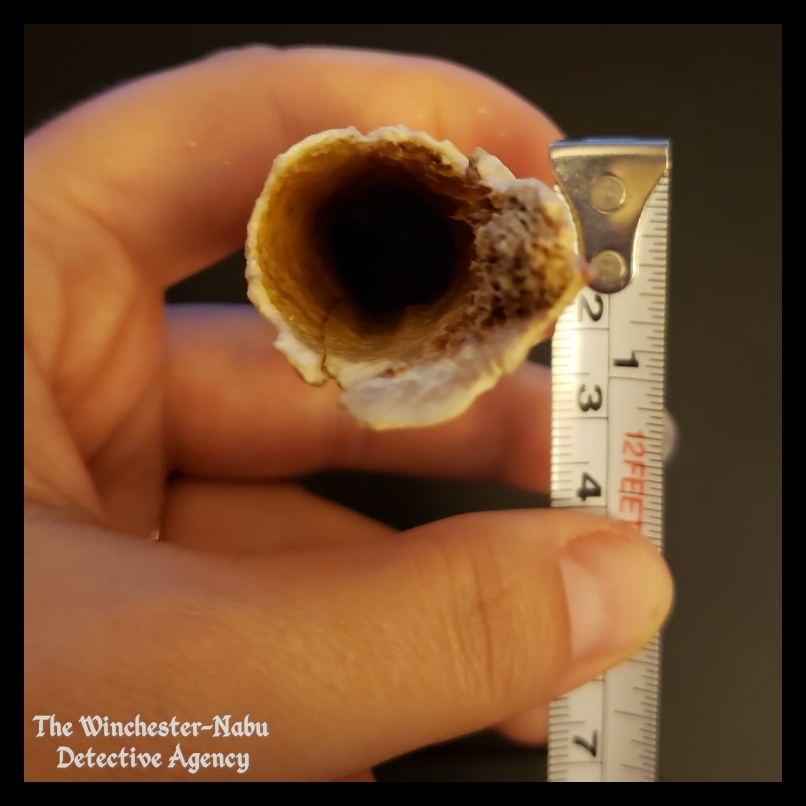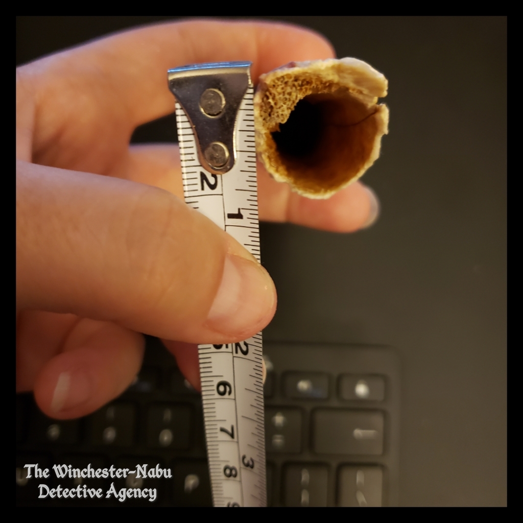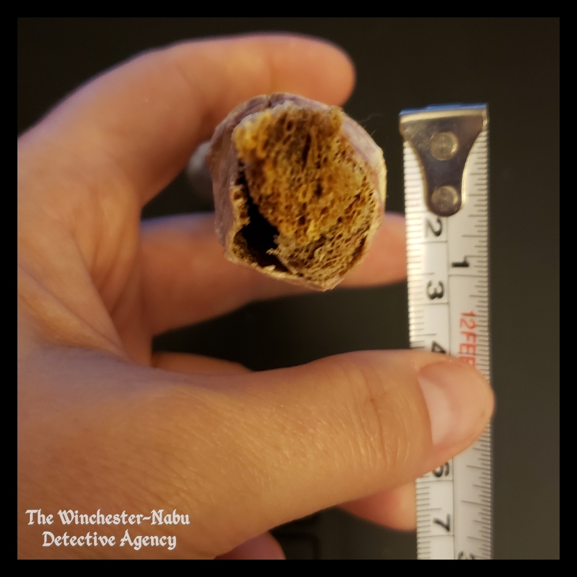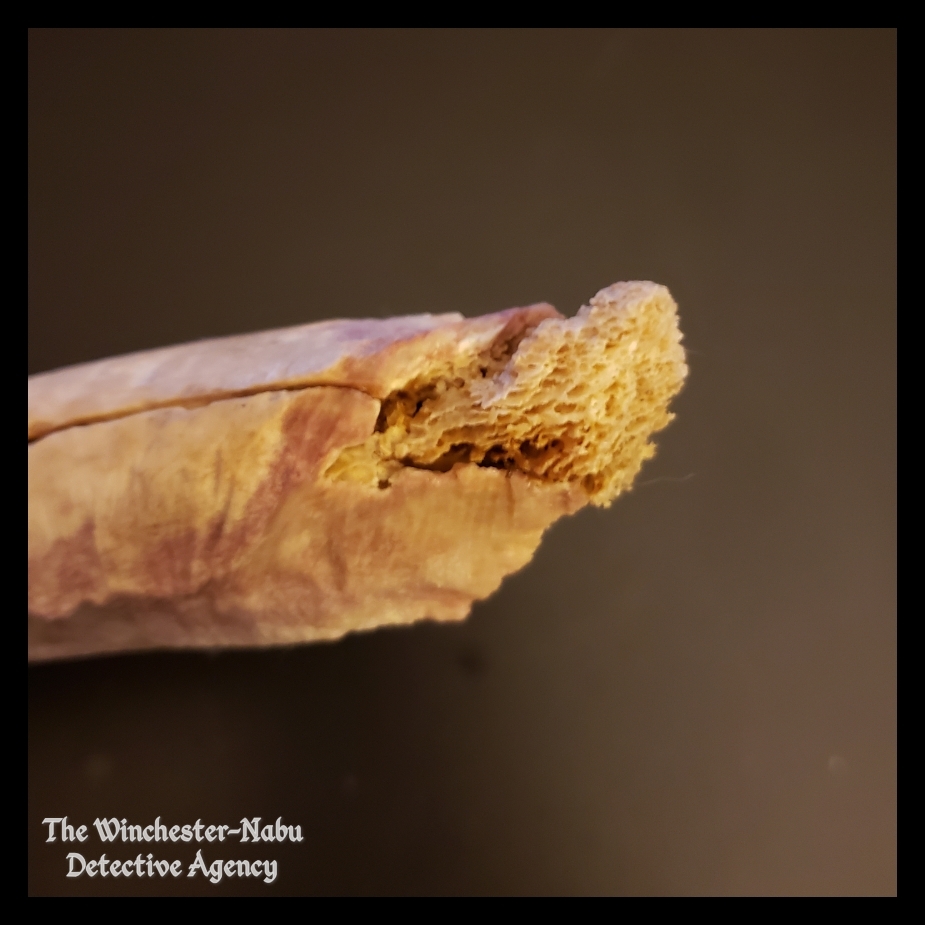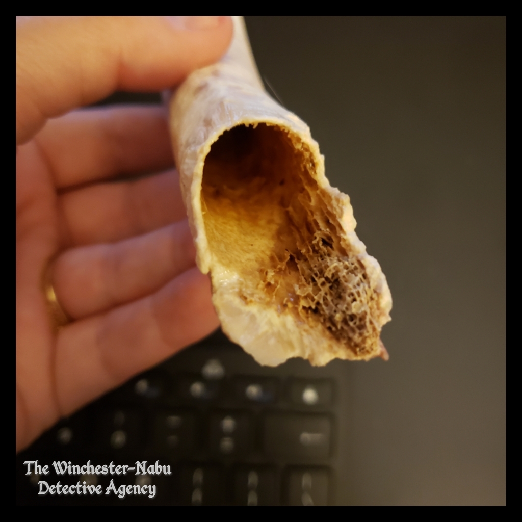 Since the first bone found had a considerably wider diameter, I thought that could have been a bigger bone of that Jersey devil-deer. I filed all of them together. But now that we have this obvious long bone with an anterior curve, we have to revisit that original case from 2017. There were two bone specimens discussed in Year One Case No. 51. Both of those had wider diameters than this Thanksgiving discovery. Those two specimens were more the size of a horse or bear!