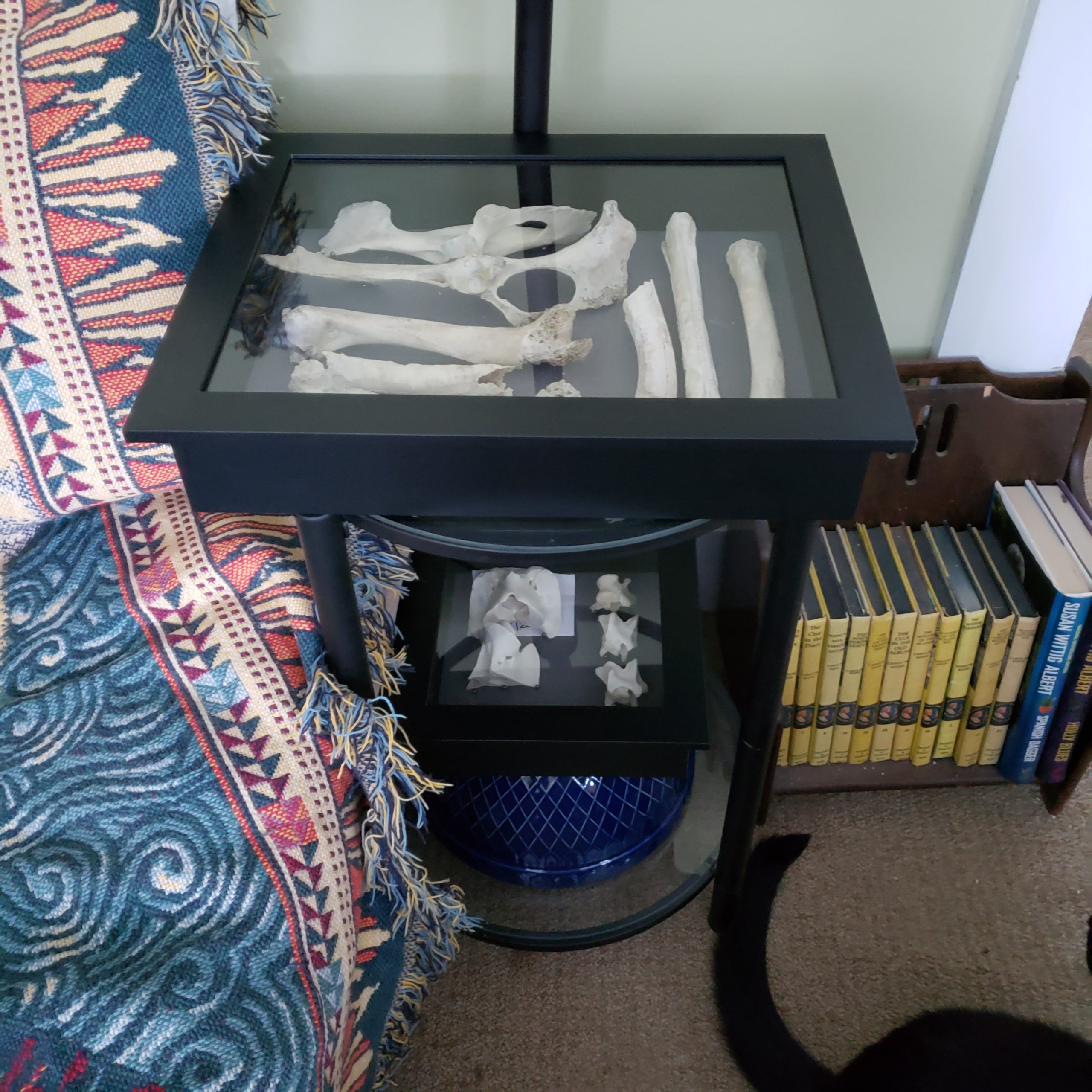 I almost bought one of the skulls: there were a couple of ducks, rabbits, and an opossum. It was the opossum that had my interest the most. It was $45 and in beautiful condition. Without having a great space to display it though, I passed. I just ordered some shadow boxes for the vertebrae and for some of the bones that Gus and I collected together. I’m not sure how to display ones with more dimension, like the skull piece we have so I’ll have to see how it all works out. An acrylic display might fit it, but then would more space on a shelf. Right now, the bones are in a lovely pottery bowl between books and statuettes.