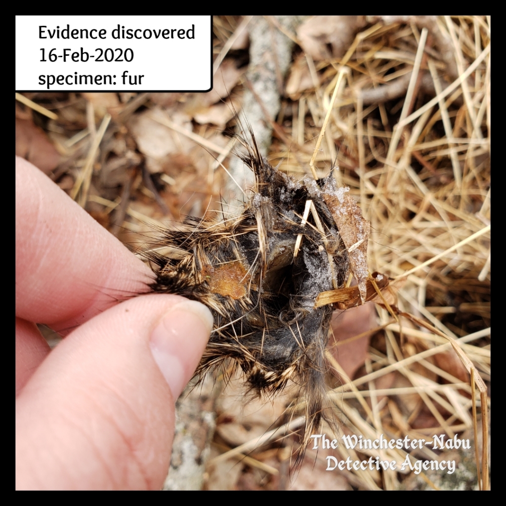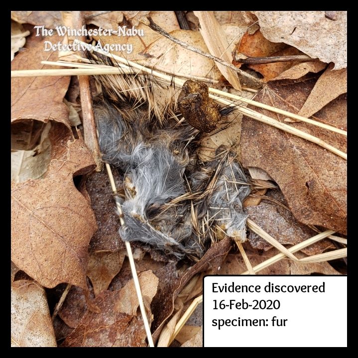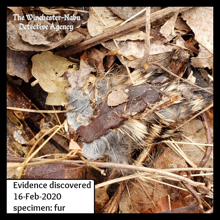 The coloring of these samples looked distinctly different from the last discovery. Their texture was different too. These were thinner and softer. There was more grey in them. I immediately realized it had to be a rodent given the length of hair. It was certainly not as cotton-soft as the wolpertinger specimen. Rodents matching these colors and length could only be squirrels or chupacabra if we’re going to consider magings of the neighborhood.