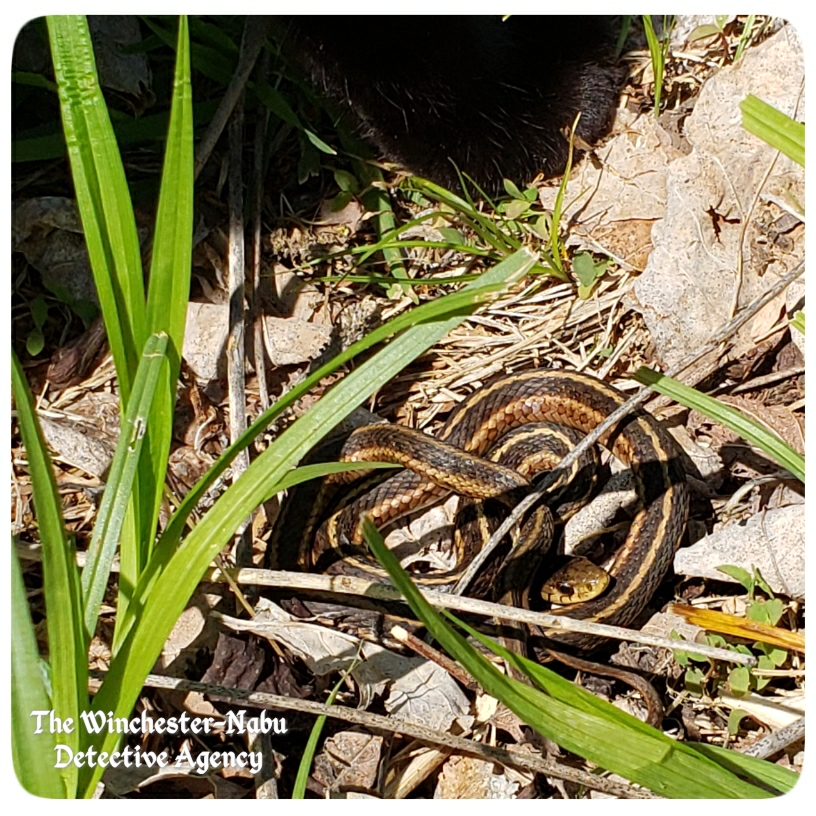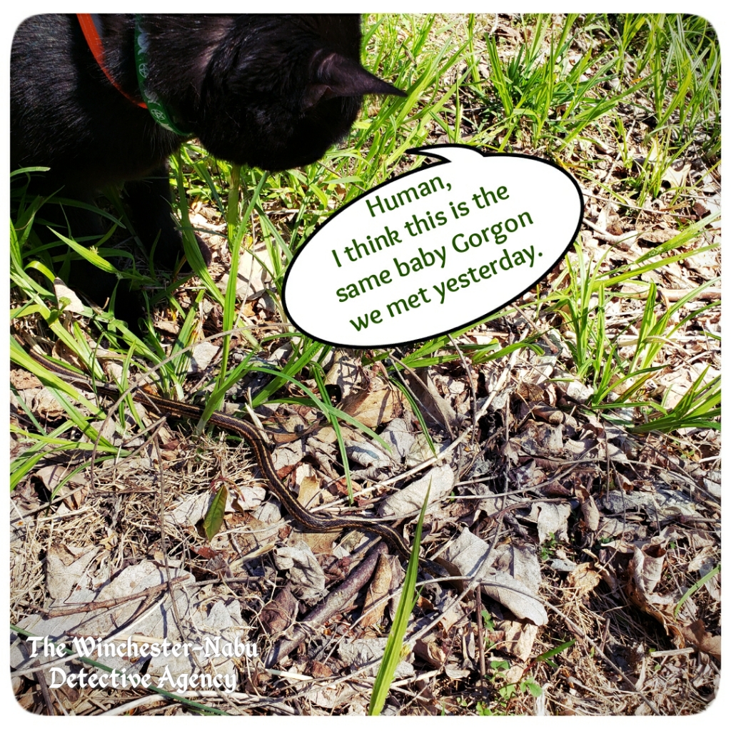 Gus spotted the little snake from a distance. Since looking upon the face of an infantile Gorgon while still in its snakey stage doesn’t turn a person to stone, I looked around where Gus lurked and took photos of the creature. The poor little thing did not want to be bothered. I think it was only out looking for some sun. Gus had other ideas. He needed a CI that could be stealth and get information about the free-roaming cats that have been trespassing.