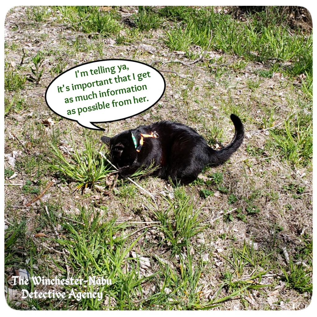 At least the terrified snake was able to give us some information. Hopefully it is not too traumatized by the events. Faustus has been seen a pretty far distance away from the Winchester-Nabu estate. The new free-roaming kitty who is grey and black striped on top and white underneath with white boots belongs to the new neighbors across the street and two houses down. This is also the house where a large dog busted out the front door and nearly got smashed by a dump truck. Our front yards are only a few here. We are right on the road. This is why when Gus does escape, so far we’ve been lucky that he’s gone out the back. Going out the front doors here is dangerous.
