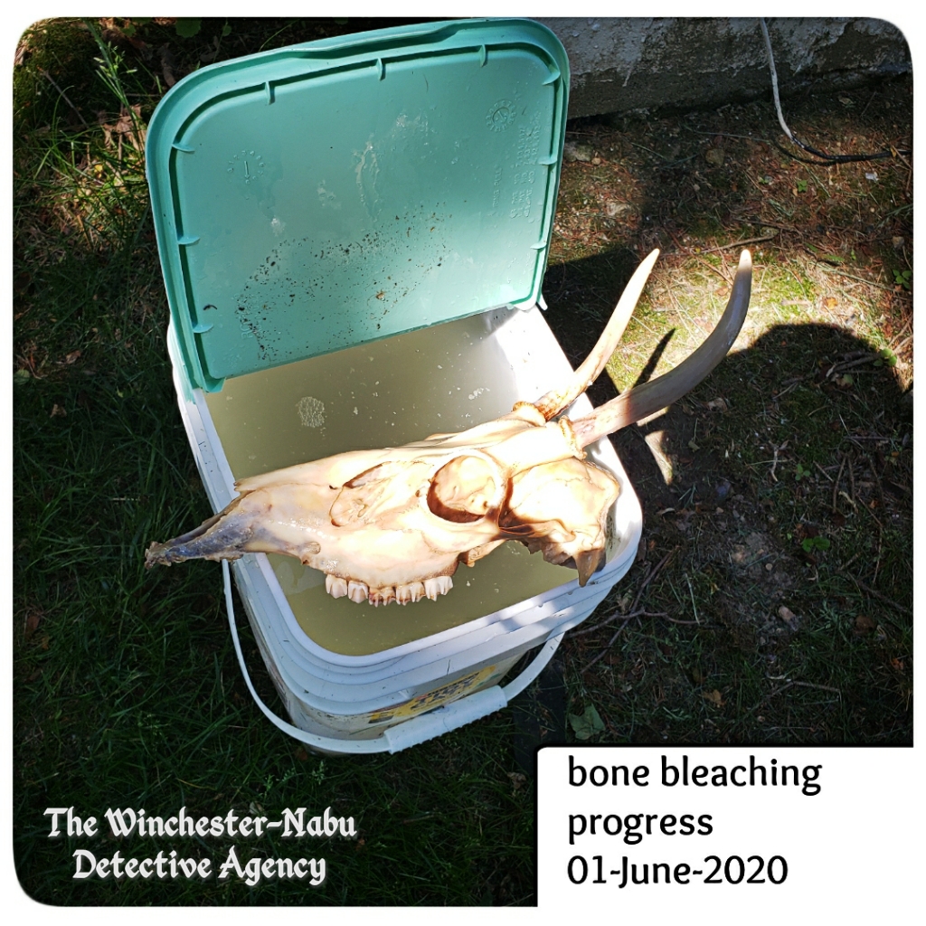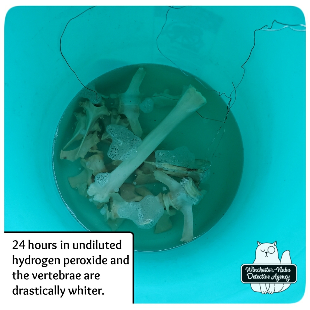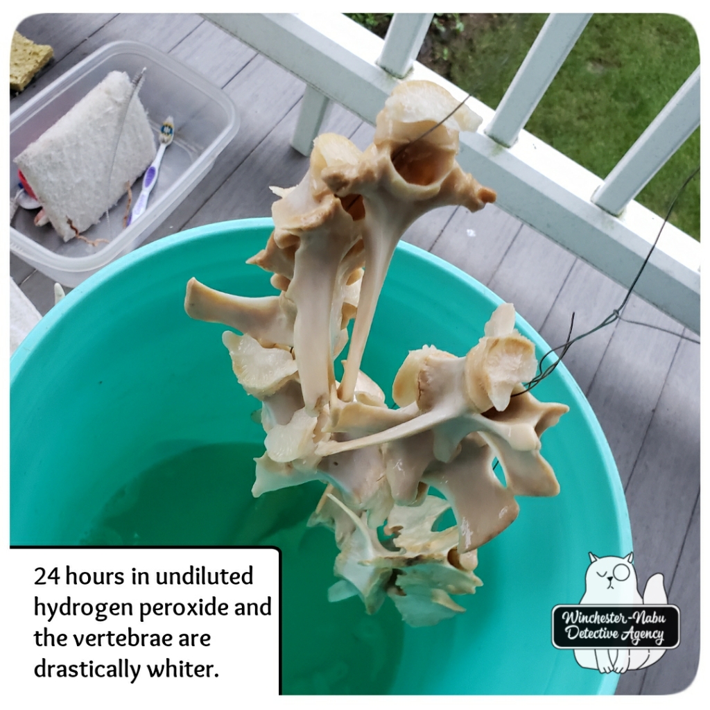 - Perhaps another scrubbing after that week. Then the bones are put into the hydrogen peroxide solution. The first batch, due to the height of the antlers and the container I used, I had to dilute the peroxide with more water than in the second batch.