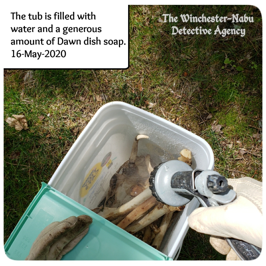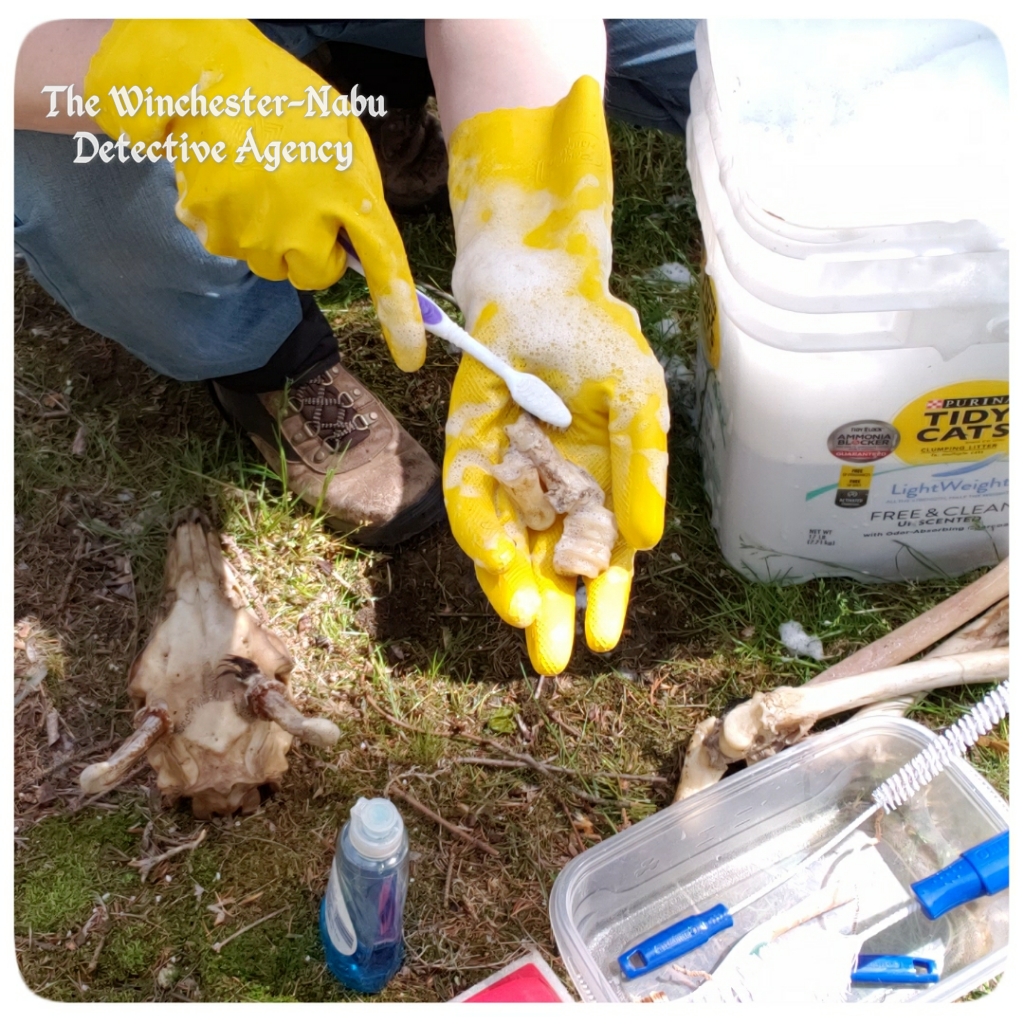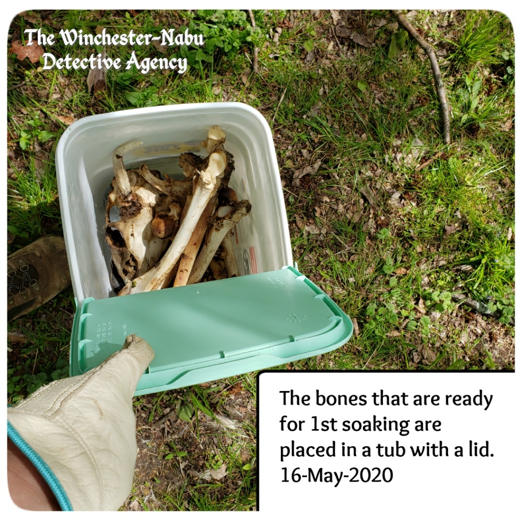 - The water is changed and the bones get a fresh soapy water bath for another week. Scrubbing the remaining soft tissue is possible here.
