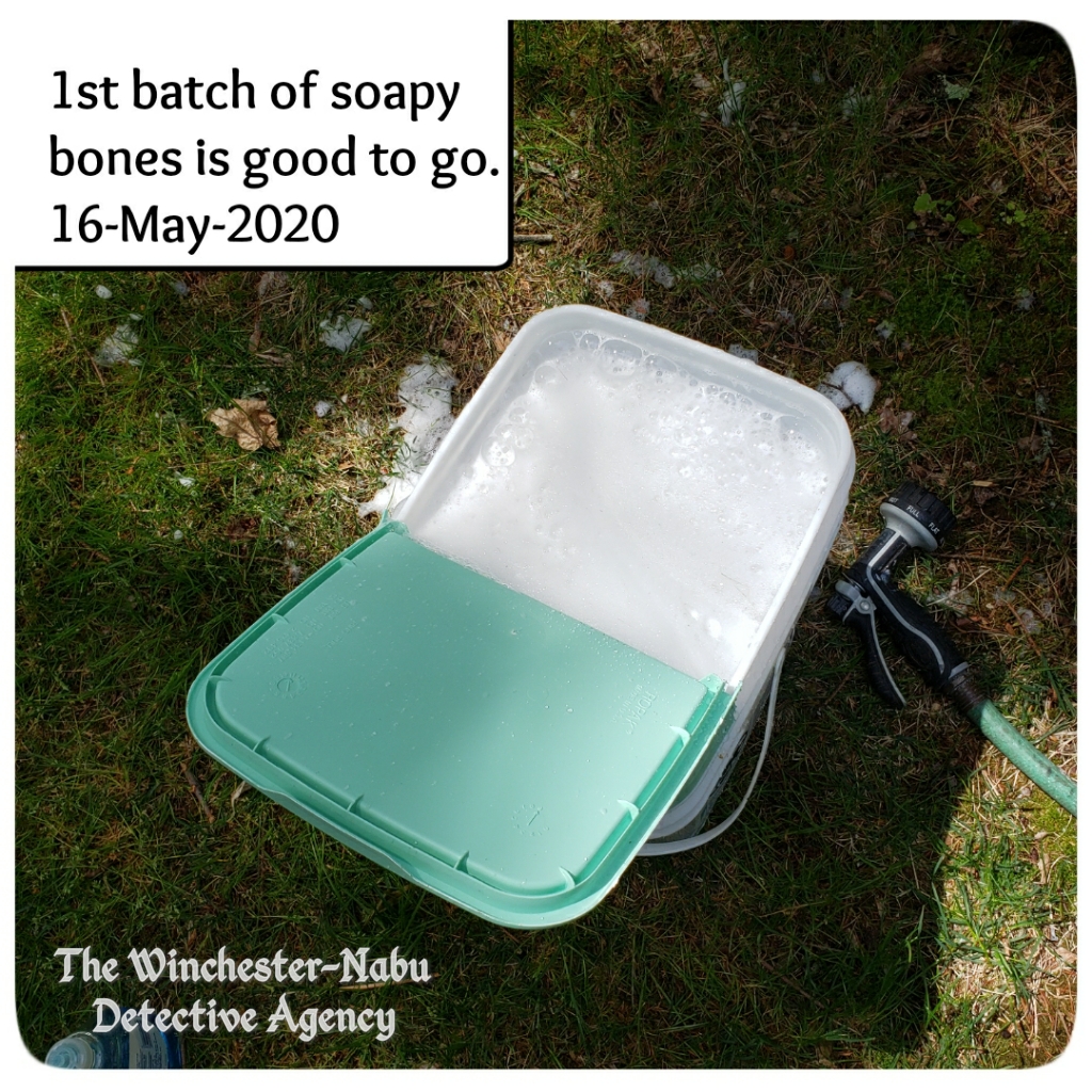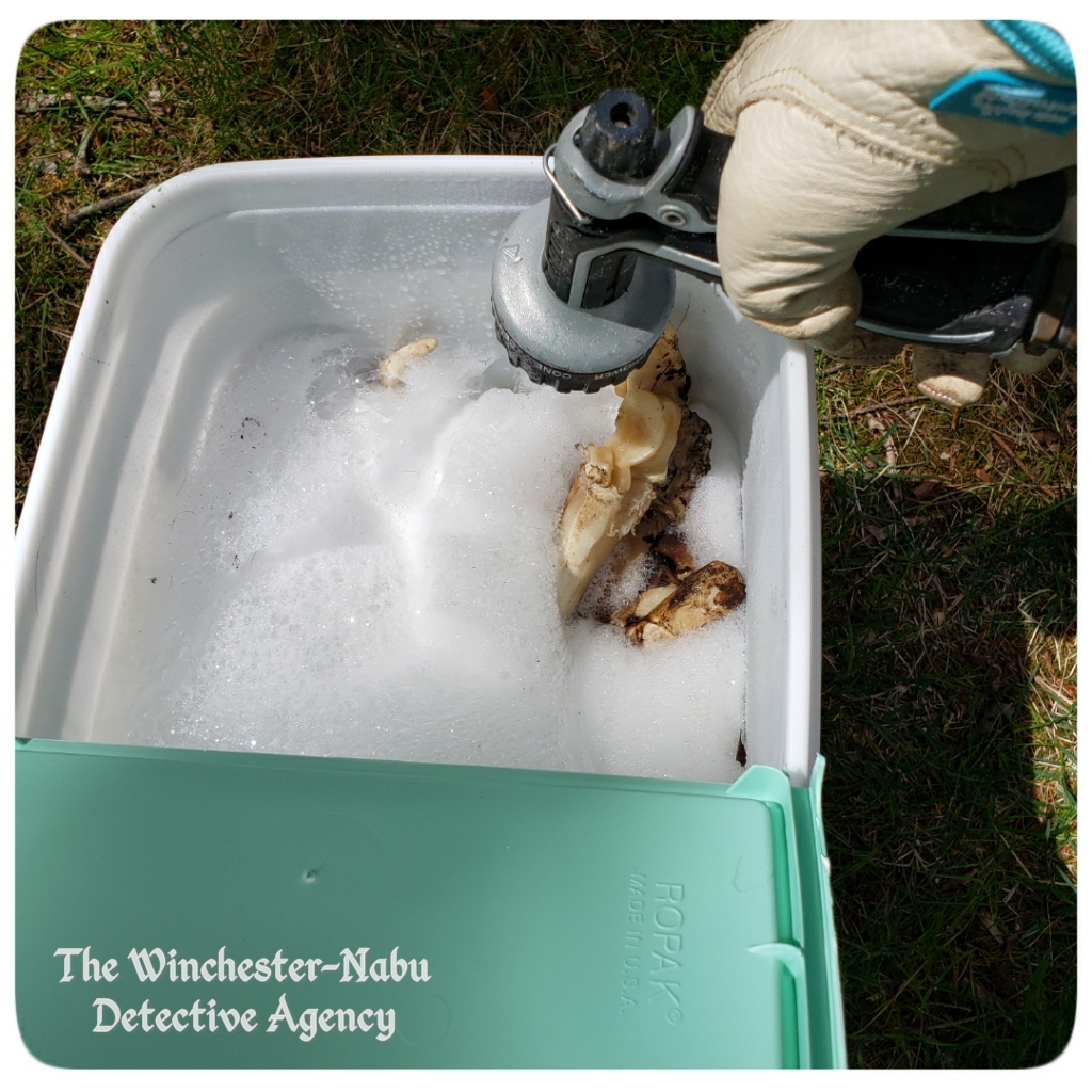 - Once the bones are as clean as possible from nature, they go into the first soapy water bath and sit for a week.