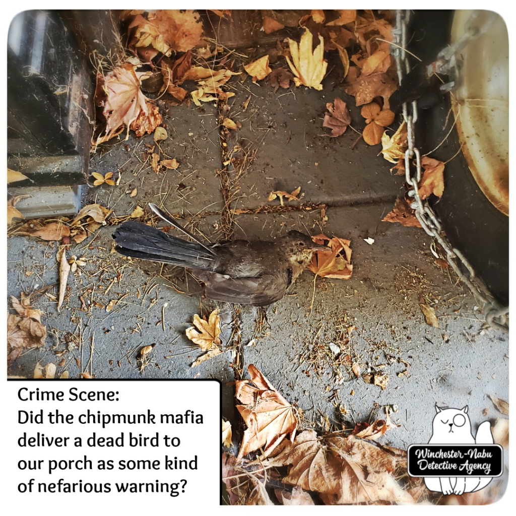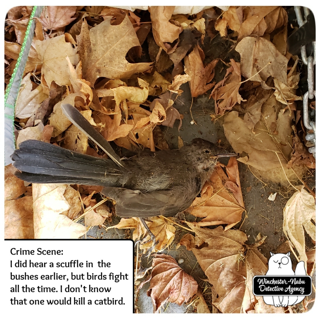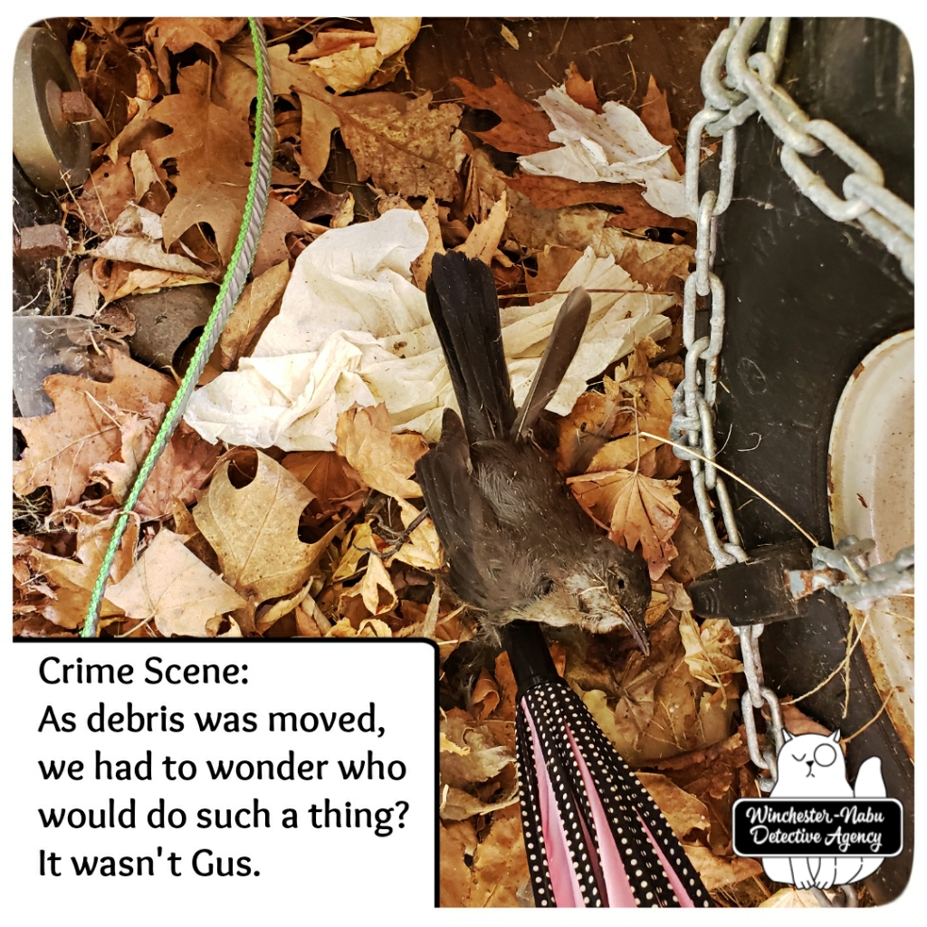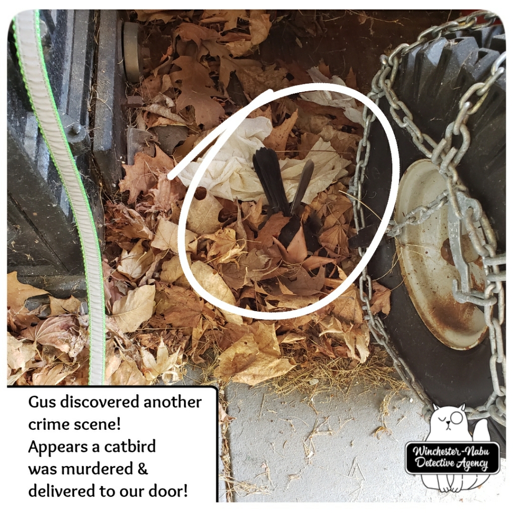 With the end of my pink and black parasol, I brushed the dried brown leaves around and uncovered a tragic site. There was the stiffened body of a dead catbird. It could have been a Halloween decoration if you didn’t know it was real. I took crime scene photos and then carried Gus through the door. I immediately told the other humans about our discovery while I unhooked Gus from his harness and collar. Before I could even present the idea of examining the corpse more closely, The Cook ordered us not to touch it. She fetched the black metal scoop used for cinders and ashes and a small broom. She was not going to let that corpse sit for another minute on her porch. She walked it over to the woods where it would be more appropriate for other creatures to take it through the end of the lifecycle.