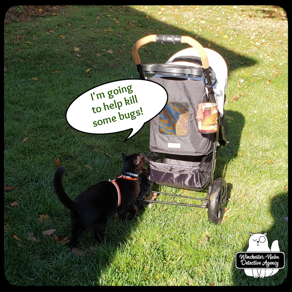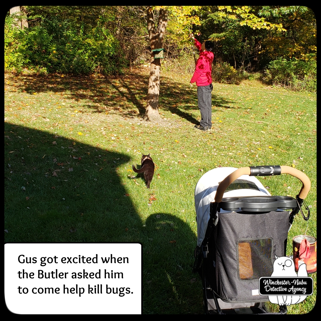 The Butler filled the back bird feeder and had Oliver nearby as usual. When the human noticed how many of the bugs were covering our special tree, he tried smashing as many as possible. Others he would knock off aggressively with a stick and Gus would catch them. This led to another new discovery: Gus thinks these lantern bugs are mighty tasty.