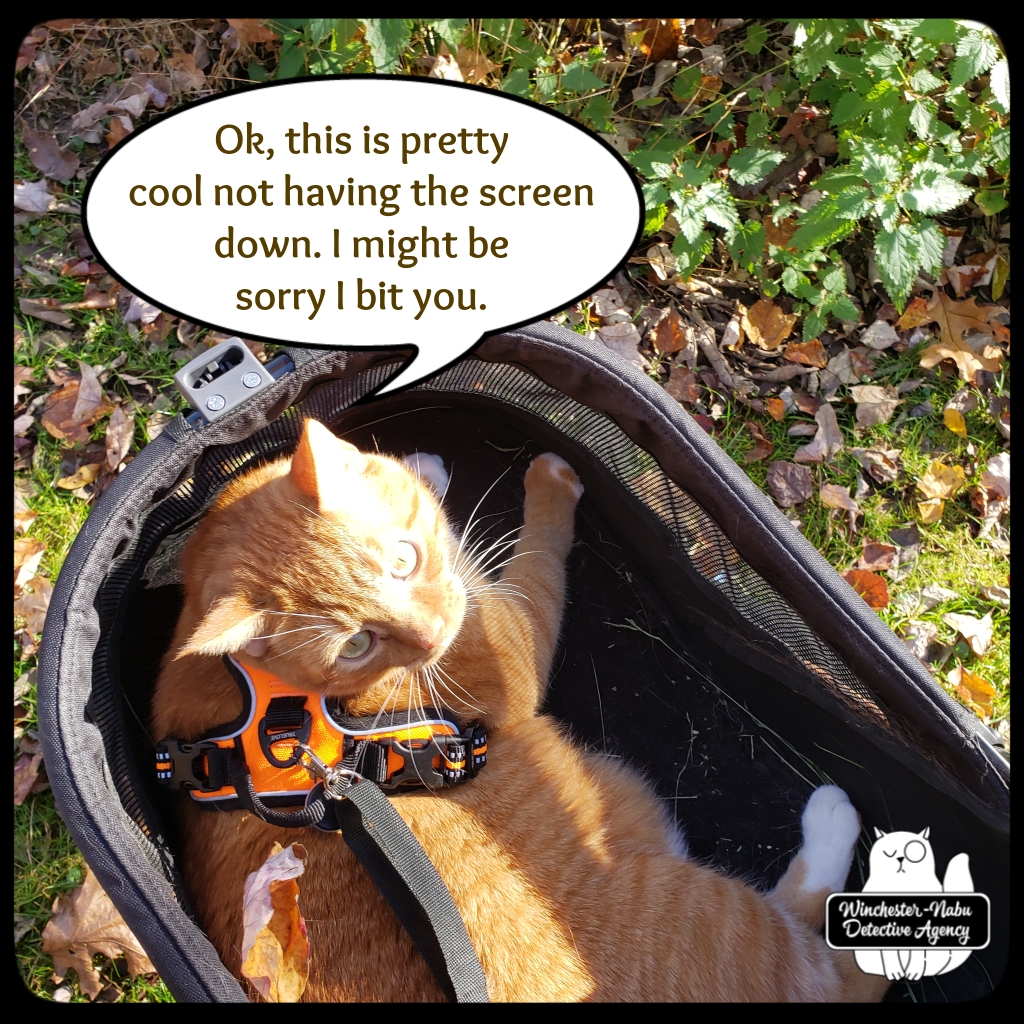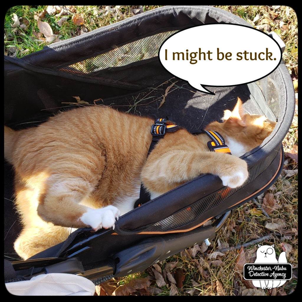 It was a horrible patrol after days of peaceful adventuring and exploring by the humans and the cats. Oliver hissed at me. Gus was close to the stroller — so being Gus and being the nosiest cat ever, he stood up to see why Oliver was hissing at his human partner. Ollie squirmed and wiggled and managed to get out of the stroller without his vest or anything. They fought, screamed, growled, hissed and ran. Oliver made it to the back door (I was glad he knew to go home) with Gus on his tail. The Cook quickly let Oliver back in the house and that was the end of Oliver enjoying his once beloved buggy.