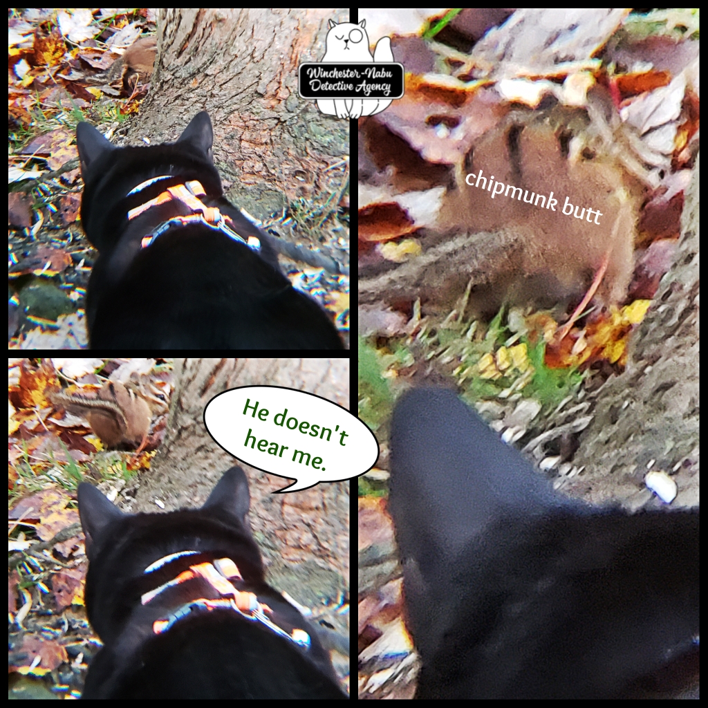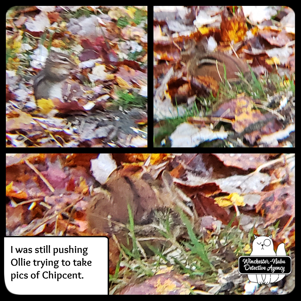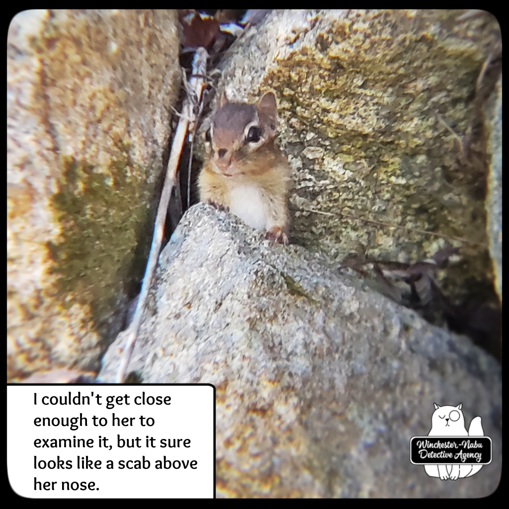 Gus found Chipcent Donofrio by the Bunny Hollow bypass at the boulder. It was still warm enough that when I put out peanuts for the birds, the chipmunks would occasionally show up to gather some too. These are the last times we saw the chipmunks before they went to hibernate and it was a rough time for them.