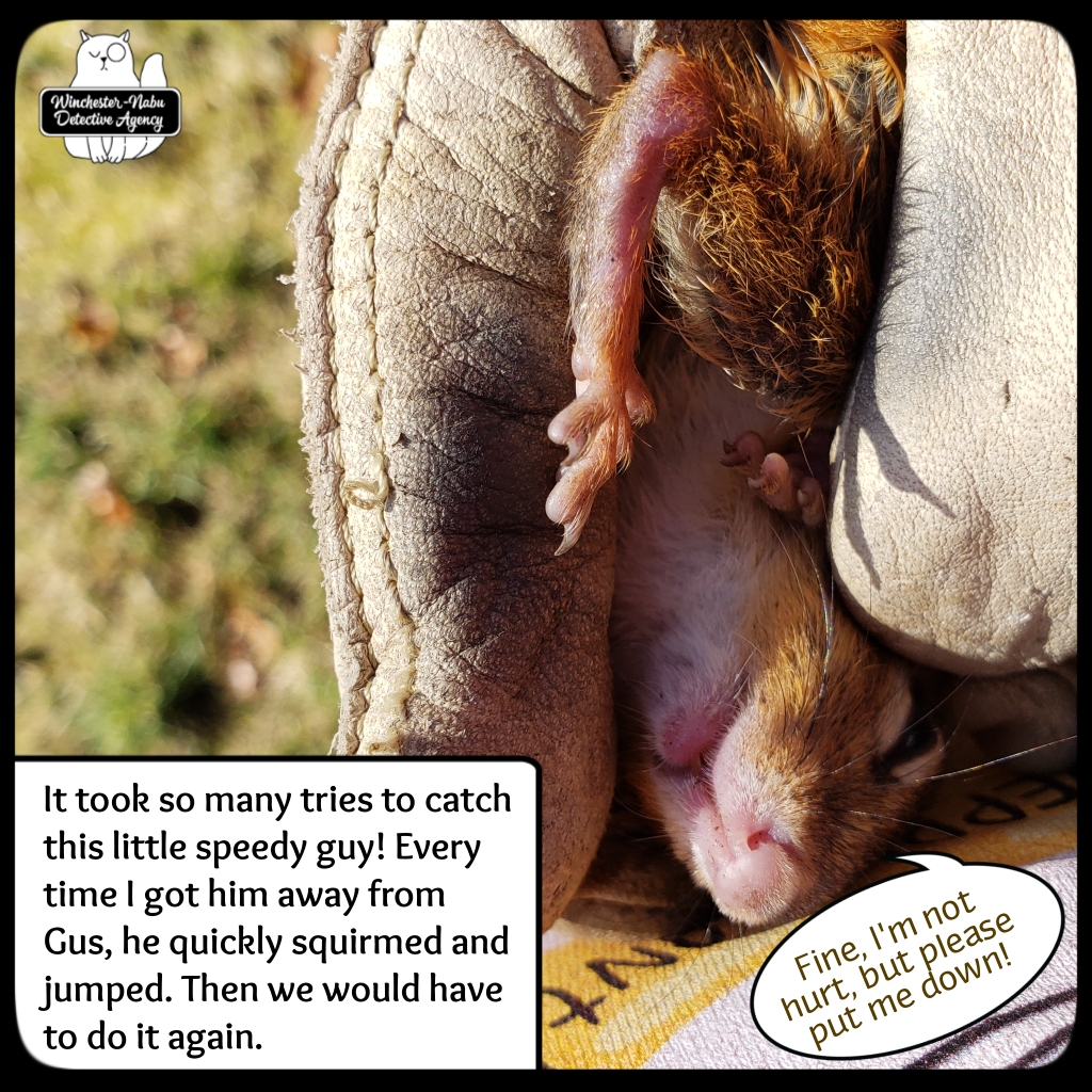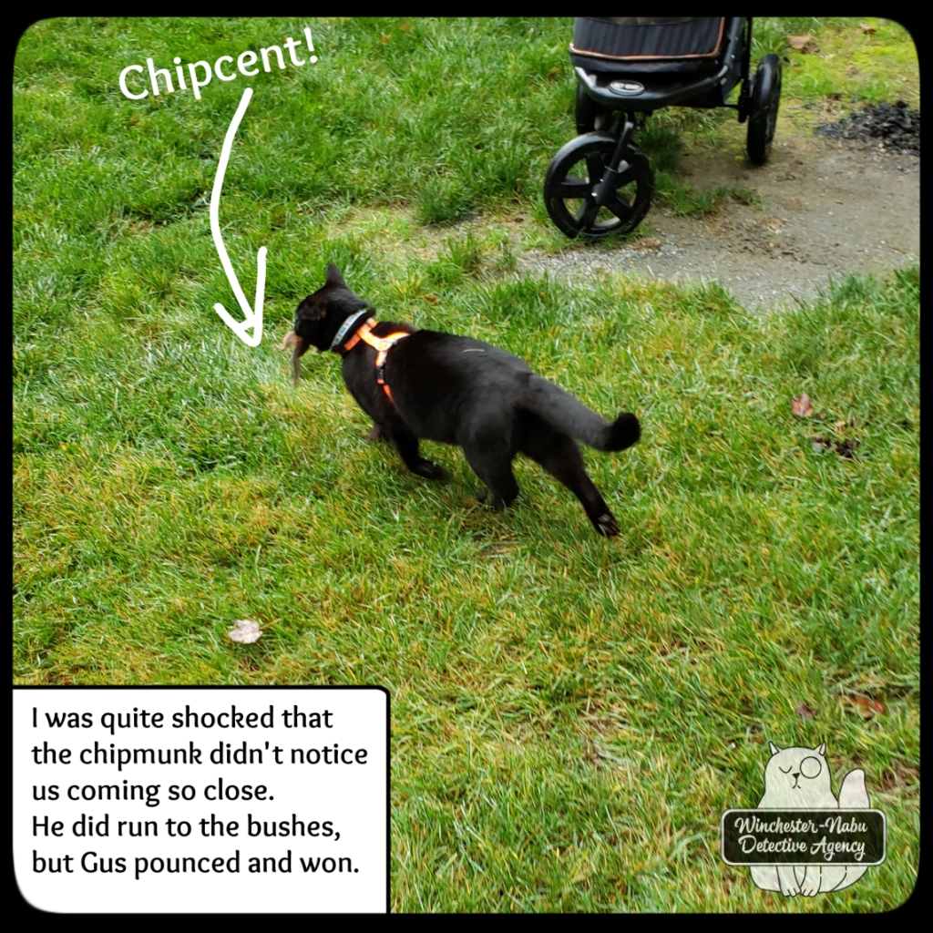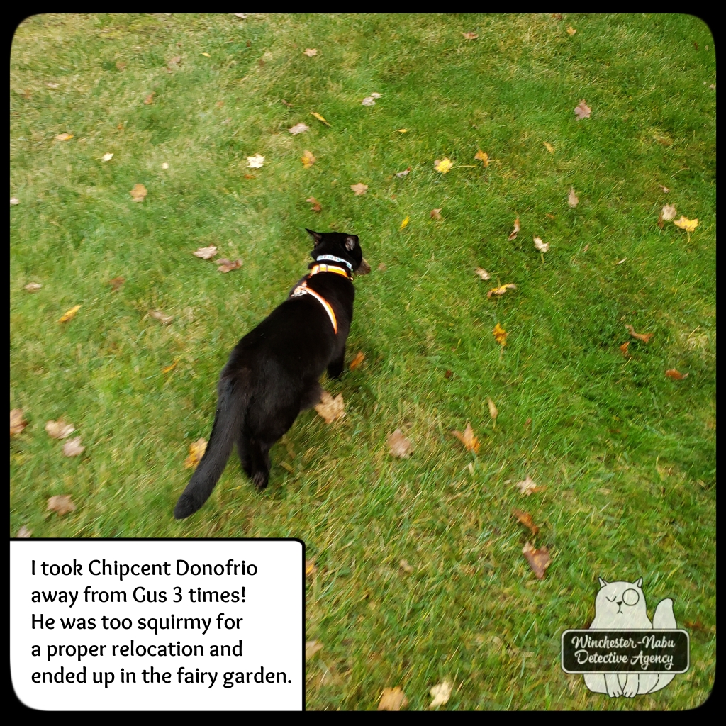 In one patrol shift, Gus caught Chipcent three times! He was too squirmy for a proper relocation and ended up running to the fairy garden and finding an entrance to the burrows there. I don’t understand how Chipcent kept getting caught and why he wouldn’t let me save him properly. Maybe it was because collecting the peanuts in October and November is so critical for the rodents.