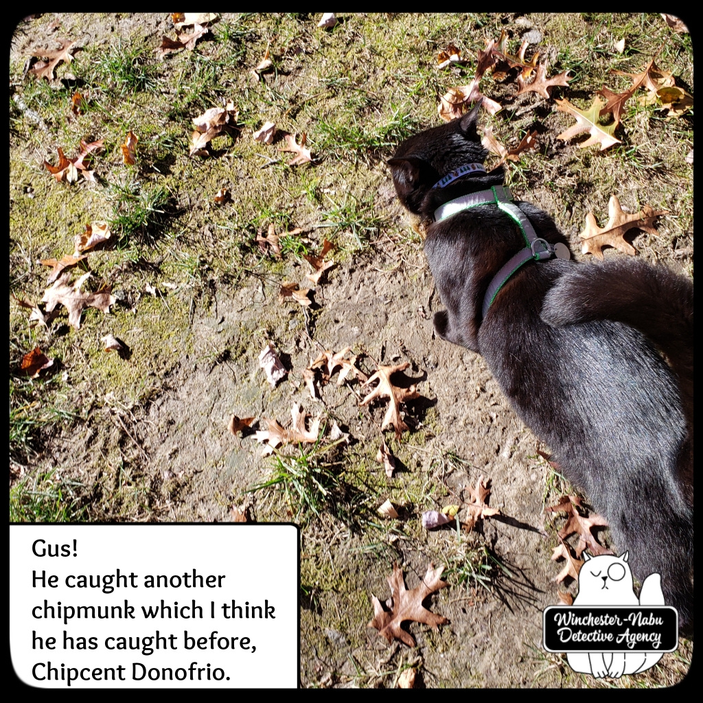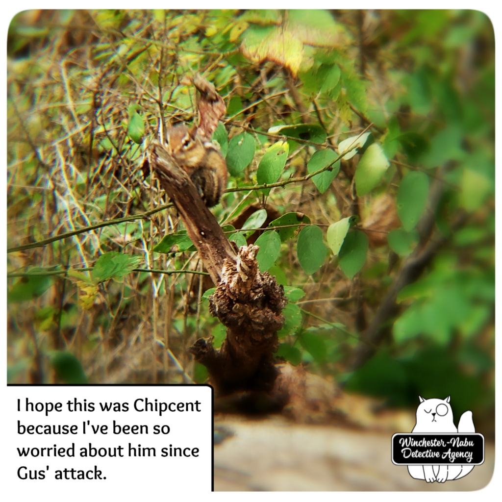 The main distraction for Gus was looking for members of the Chipmunk Mafia. He didn’t even have to. He just likes to harass and abuse them. He’s such a bully to everyone. Well, everyone except that fuzzy dog creature who has visited.