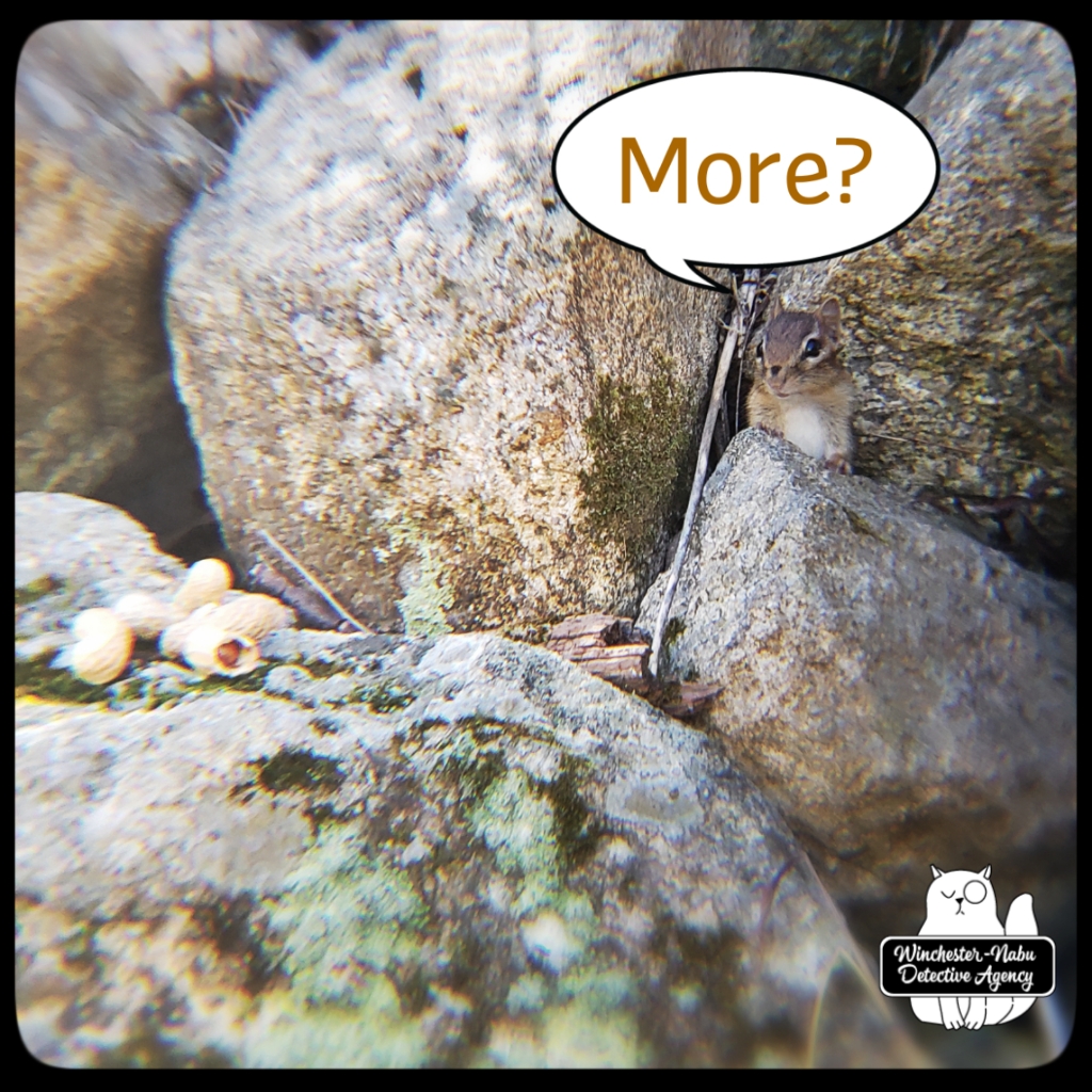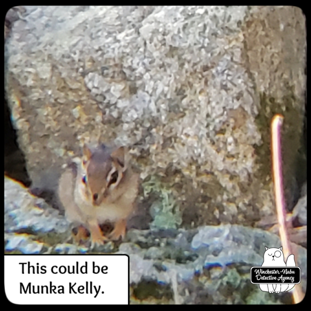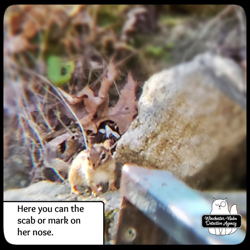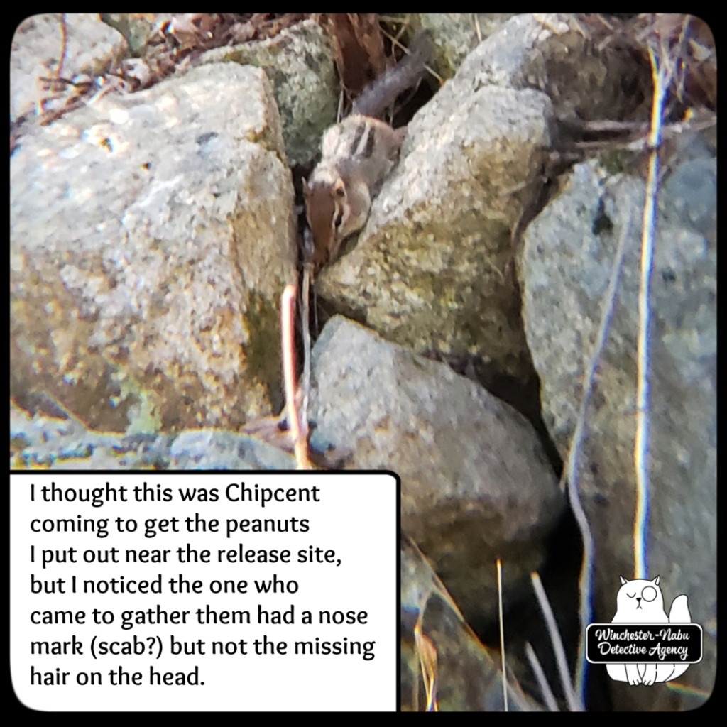 Gus found Chipcent again and ran away with him on a November day! This poor little bugger. After that capture, I think Chipcent started to send Munka Kelly to get the peanuts instead. I took a bunch of pictures of a chipmunk who showed up. I compared what I had of the Gus capture photos and noted a couple differences. The second chipmunk, presumably Munka Kelly, has a very dark triangle above her nose. She also didn’t have the scar across her head with missing fur. I was worried that the nose marking was a scab and that Gus had attacked two different chipmunks, but I looked at chipmunks on Instagram (@vangoghthechippy @bikke_the_chip) who are pets and have great close up videos; and I enlarged these photos and could tell that it was not an injured snout.