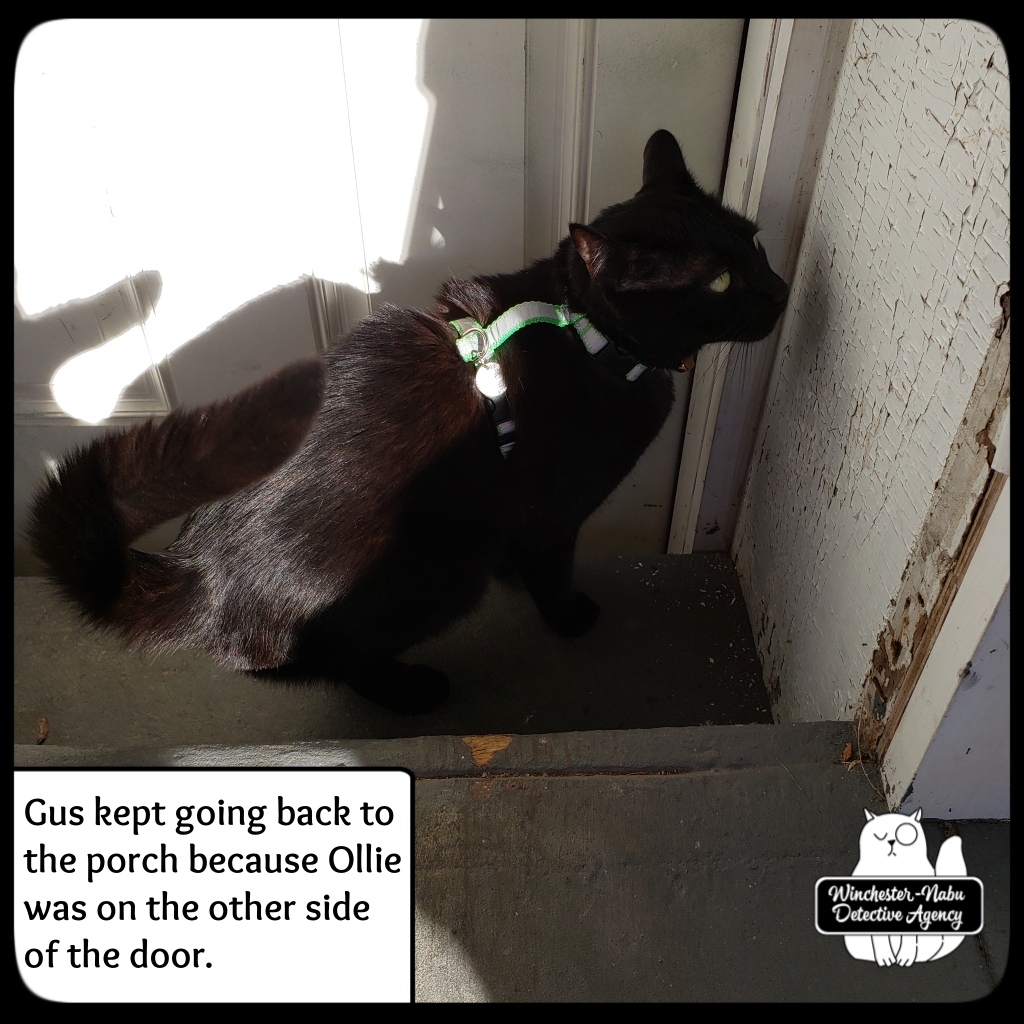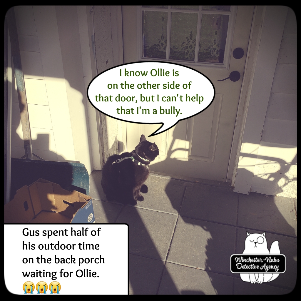 October 23, 2020 was after Gus and Oliver had their massively traumatic fight outside. I couldn’t get Oliver to go in buggy at all, but he kept going to the back door like he wanted to run out the way Gus does. But even Gus is supposed to wear his proper adventure gear. Gus knew something was wrong too. The first day we tried to go out without Ollie, Gus was out of sorts emotionally. He spent half of his outside on the back porch looking for Ollie.