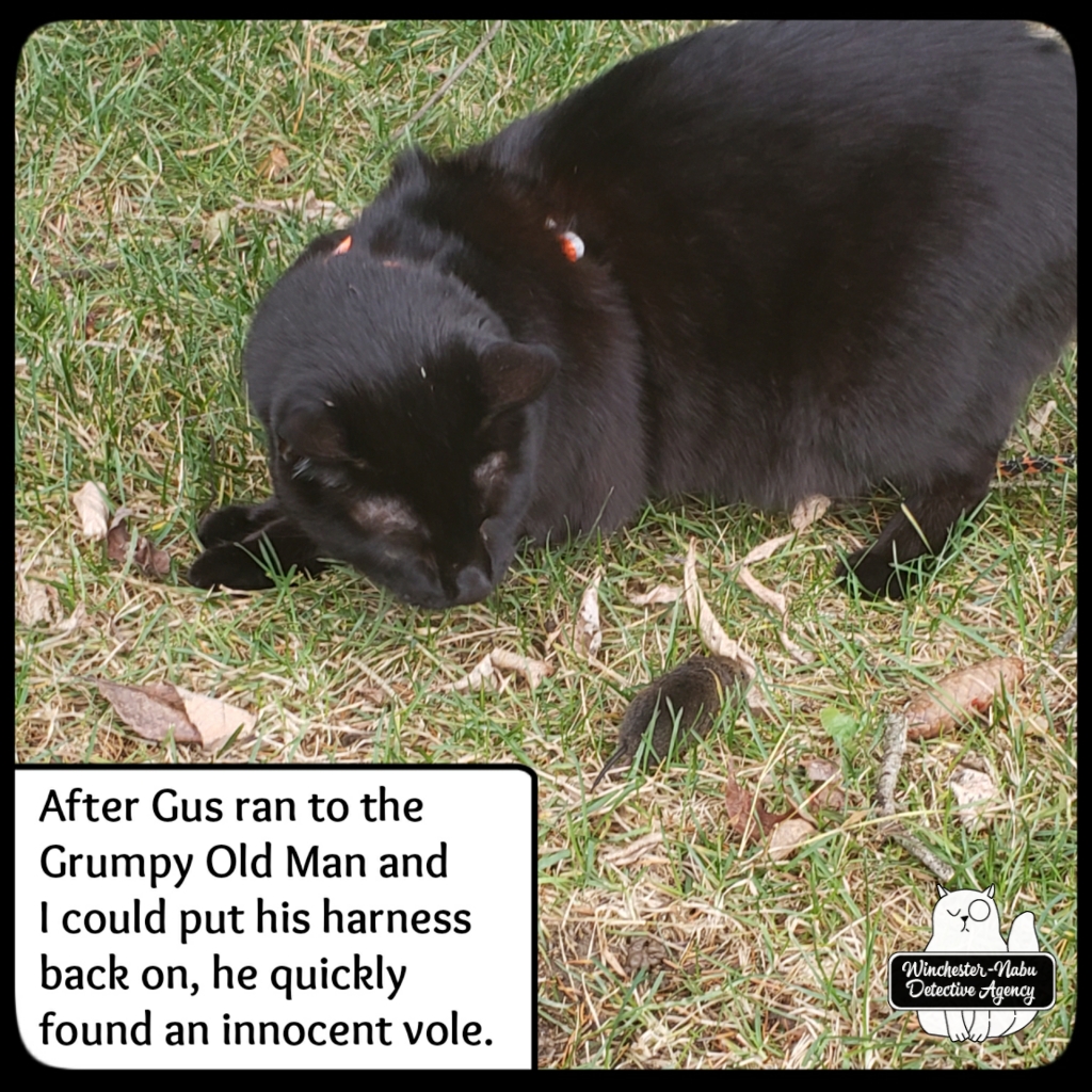 Gus would have said, “I got him!” but his mouth was full of vole and leaves. It looked like he was going to take it back to show the Grumpy Old Man what a great job he did, but Gus does this funny thing: he aims for someone or maybe a door and at the last second dodges. His peppy trot is always a clear indicator when he has captured something valuable (in this case “voleable”).