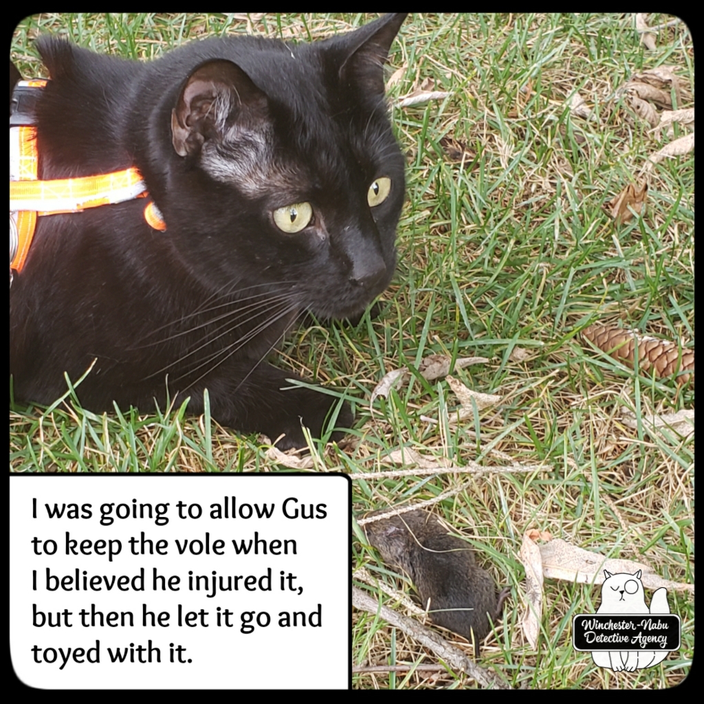 Unfortunately for Vole Porter, one of my rescue and release attempts did not go according to plan. Gus snuck up behind me. I twisted and turned to the left to get out of the weeds. Gus approached from my right and snatched Vole Porter from the berm. That time, it was fatal.