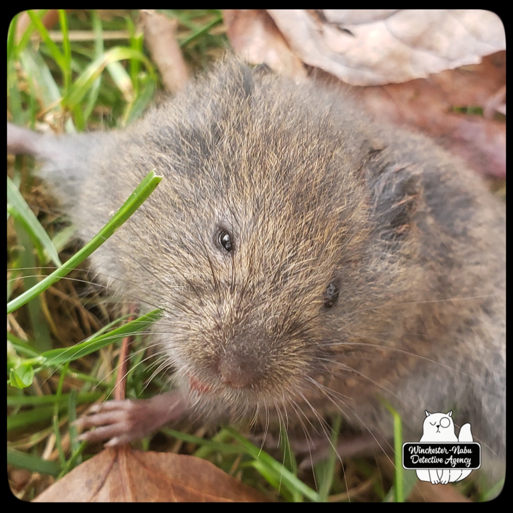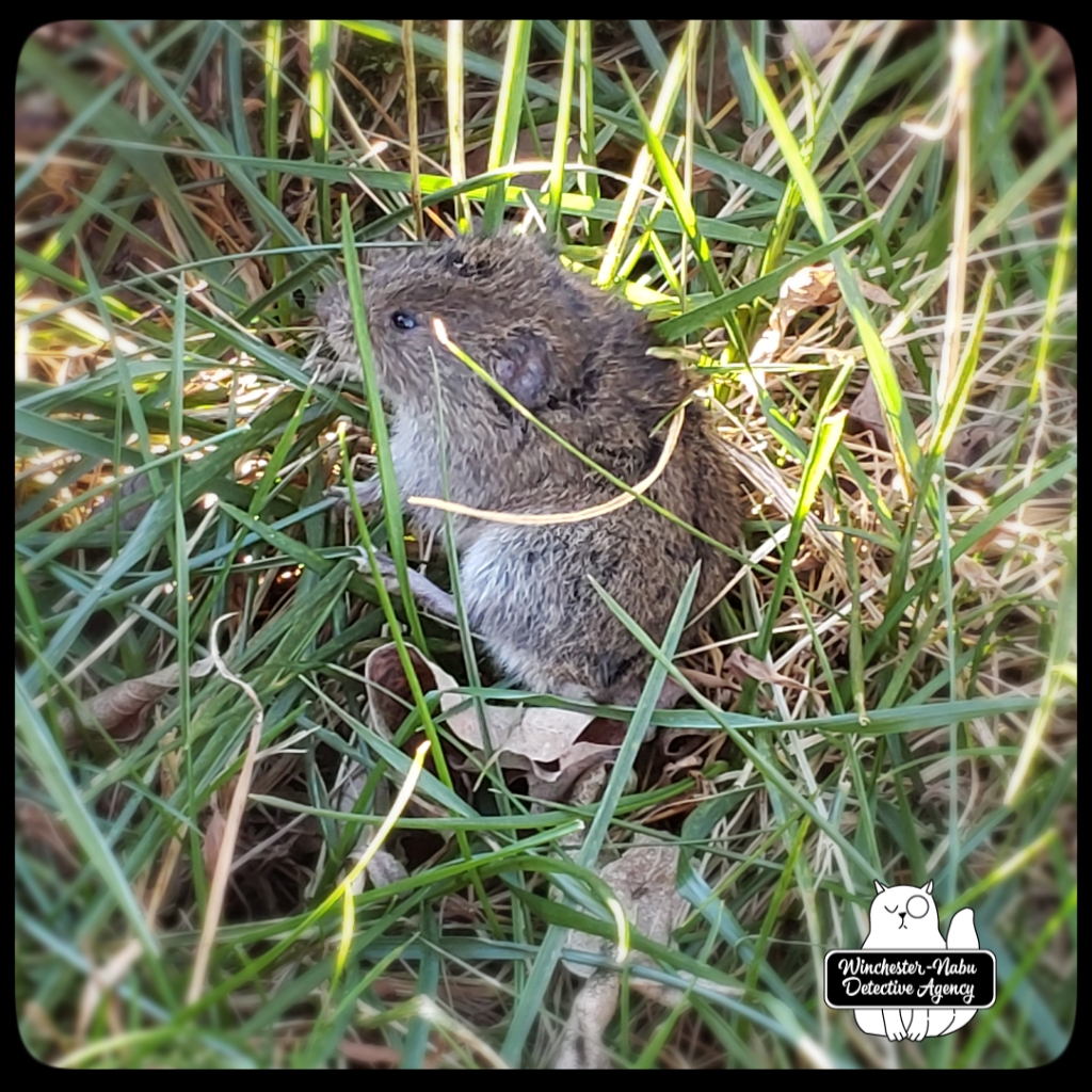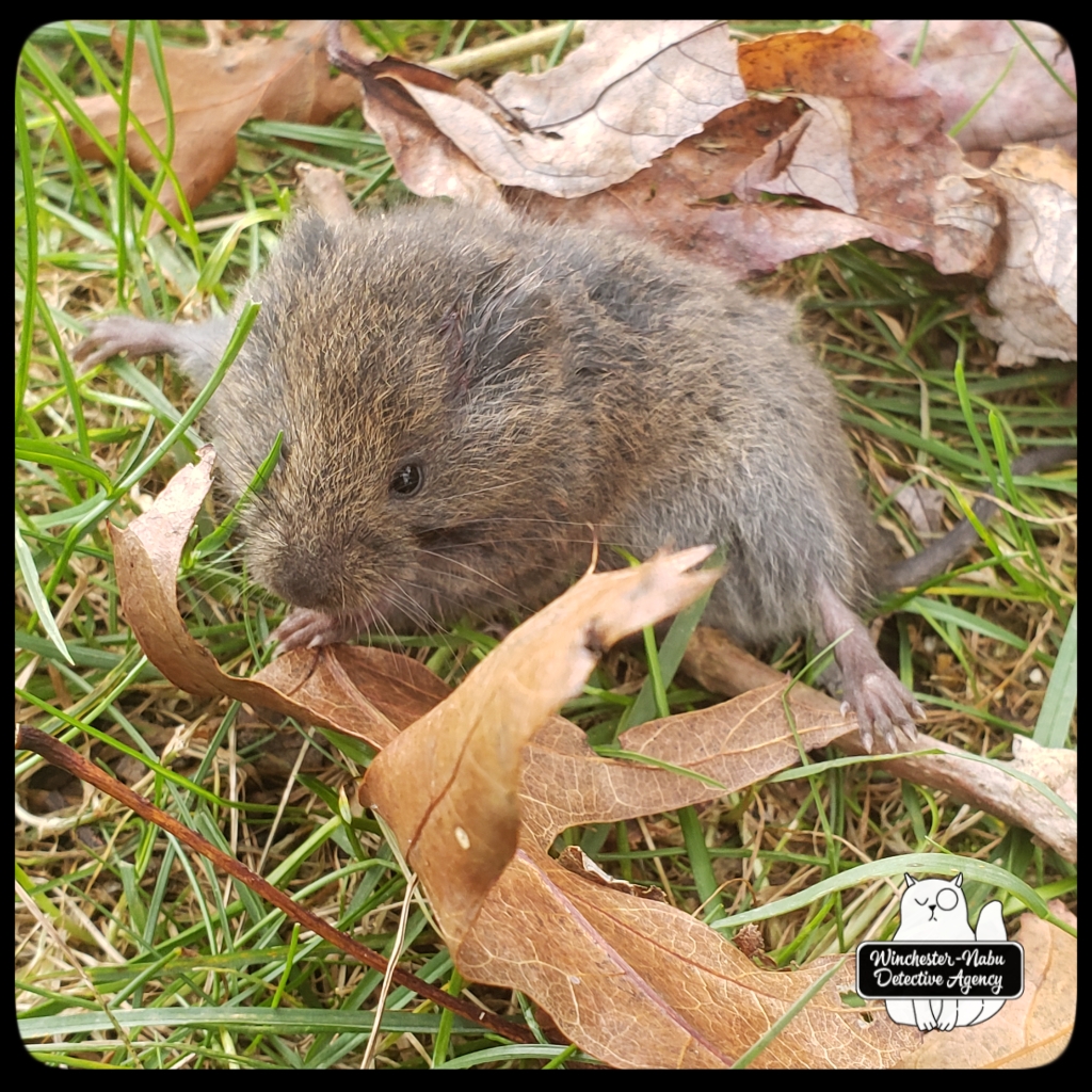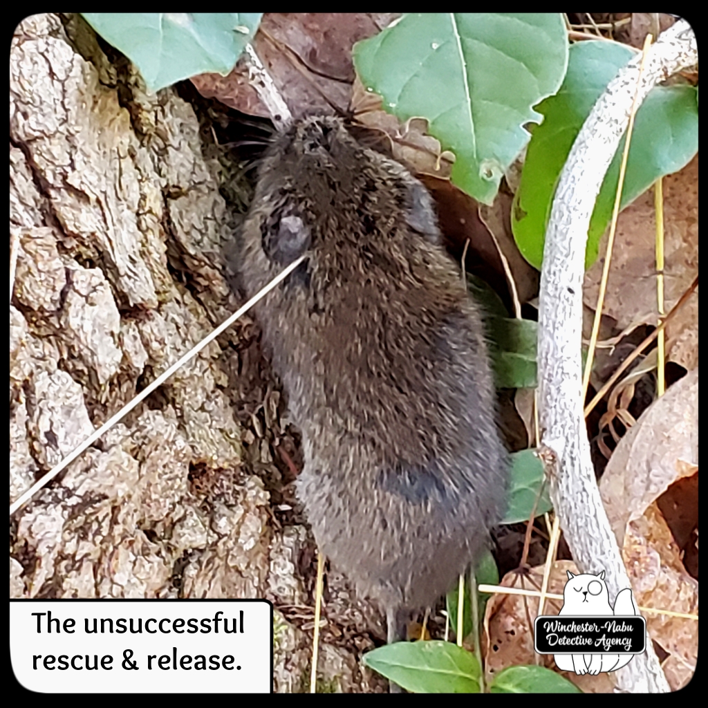 I’ve written about Vole Porter before, back in June. He hails from the northern border in the berms separating the yard from the deep woods. I’ve always been fond of this little fellow. He’s what the kids today would call a BAMF, badass motherfucker. We hit it off when Gus yanked him from the comforts of his burrow and Vole ran over to my boots begging for help. Back then, I was able to successfully release him. I also need to stop taking gloves off with my teeth after I’ve handled living or dead creatures.