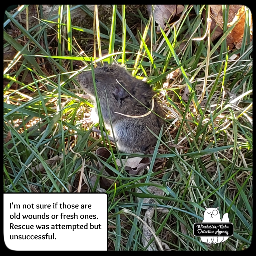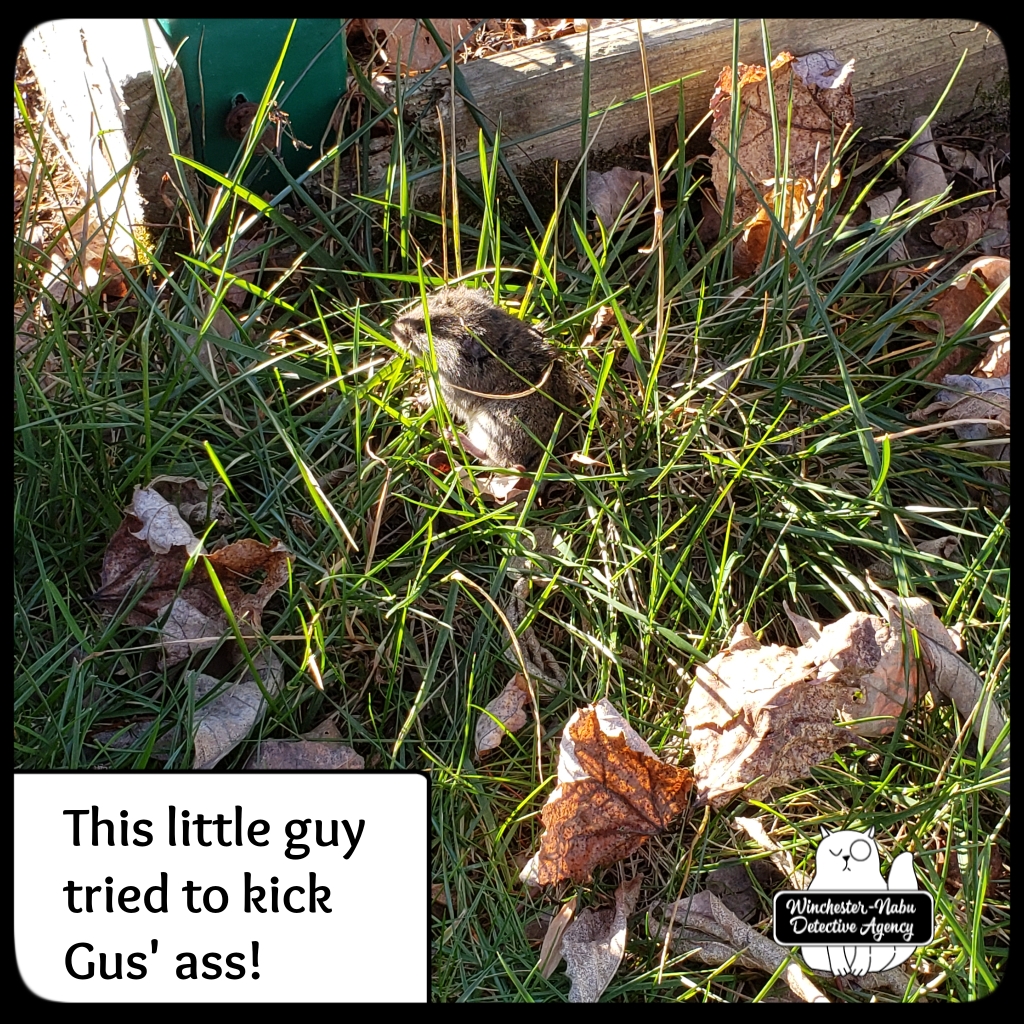 Vole Porter did not find my attempts at rescuing him any comfort although he was definitely much easier to handle than Chipcent Donofrio. When Gus had him in his jaws, it sure looked like the blood coming out of the vole meant it was already deceased. He had such fight in him. He got up like Rocky Balboa numerous times and attacked Gus! There was one moment when Vole Porter jumped on Gus’ backside and did a spinning ninja move over him! I used to think the idea of ninja turtles was laughable, but I have now witness a ninja rodent so… who am I to judge?