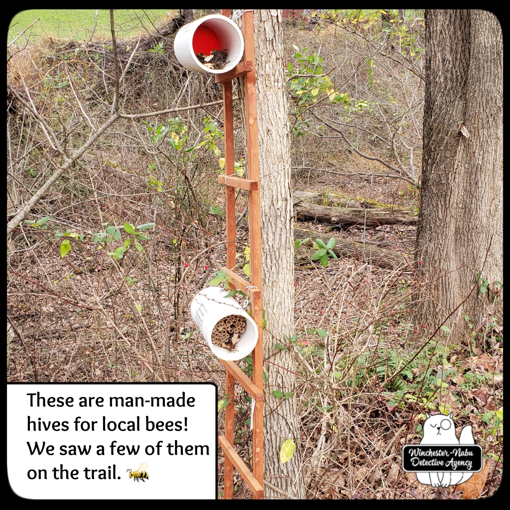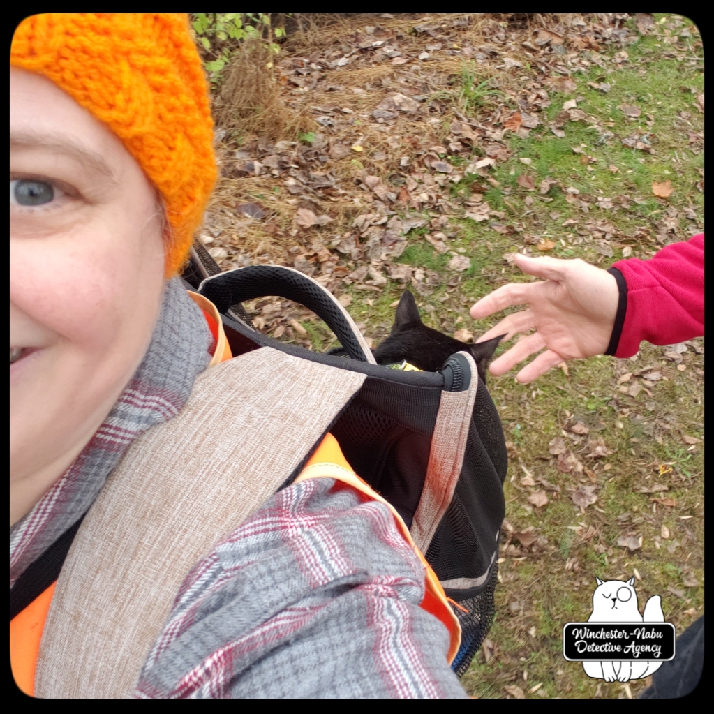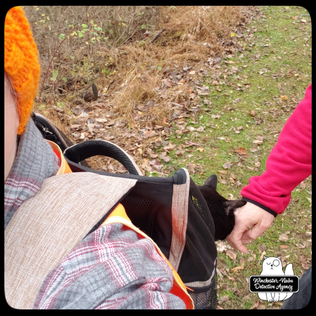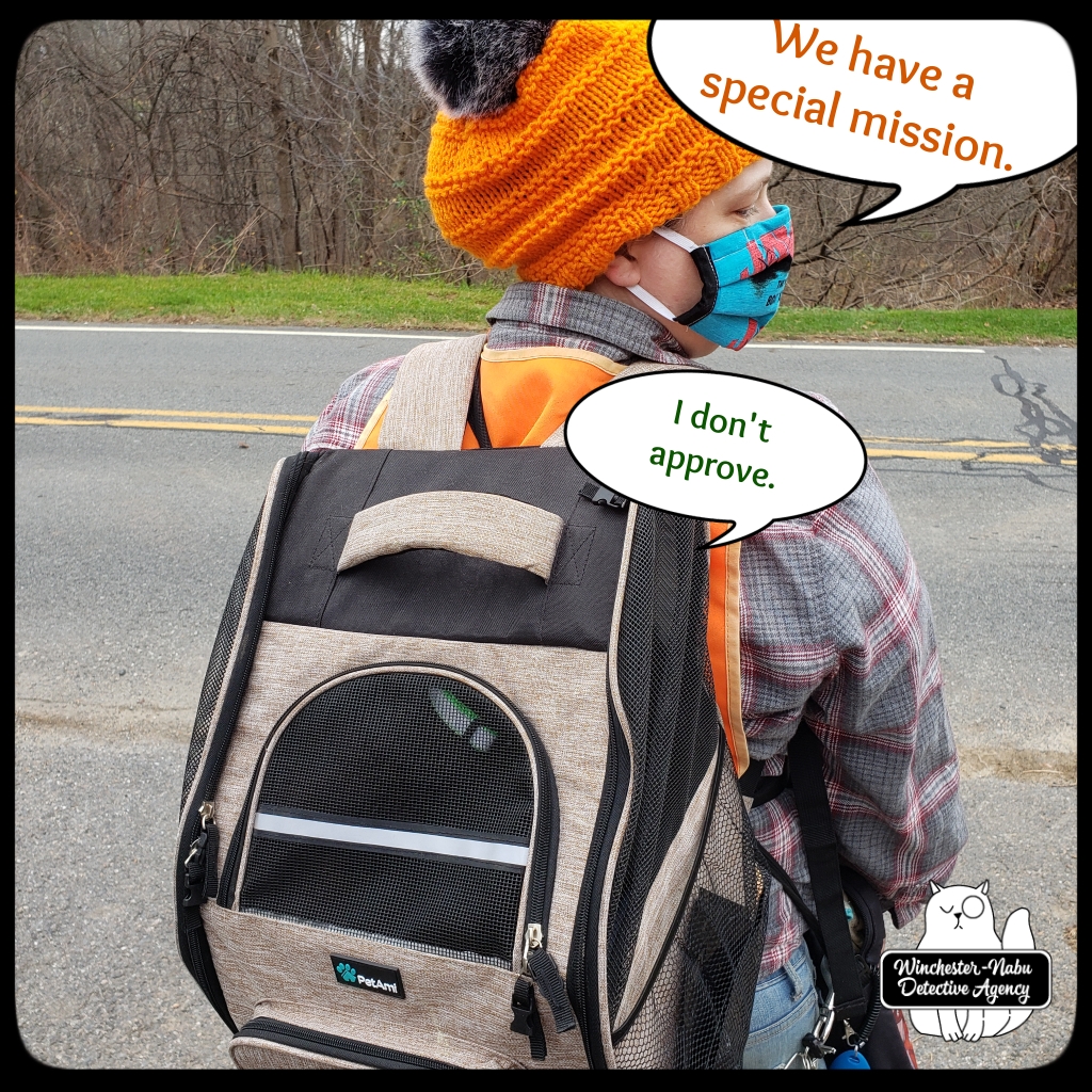 Since that was a pleasant weather day, we took Gus and Oliver out for patrols first. Then I packed Gus into the mobile feline transport unit — the backpack. Gus has used his backpack only a few times. During this excursion, having the Butler there to keep an eye from the rear was a big help. Gus was able to be tethered to the short leash on the inside of the backpack so that his rooftop screen could be opened once we got off the street and onto the trail.