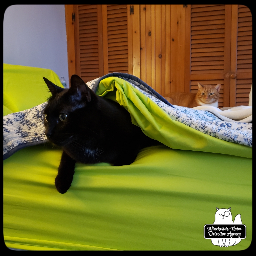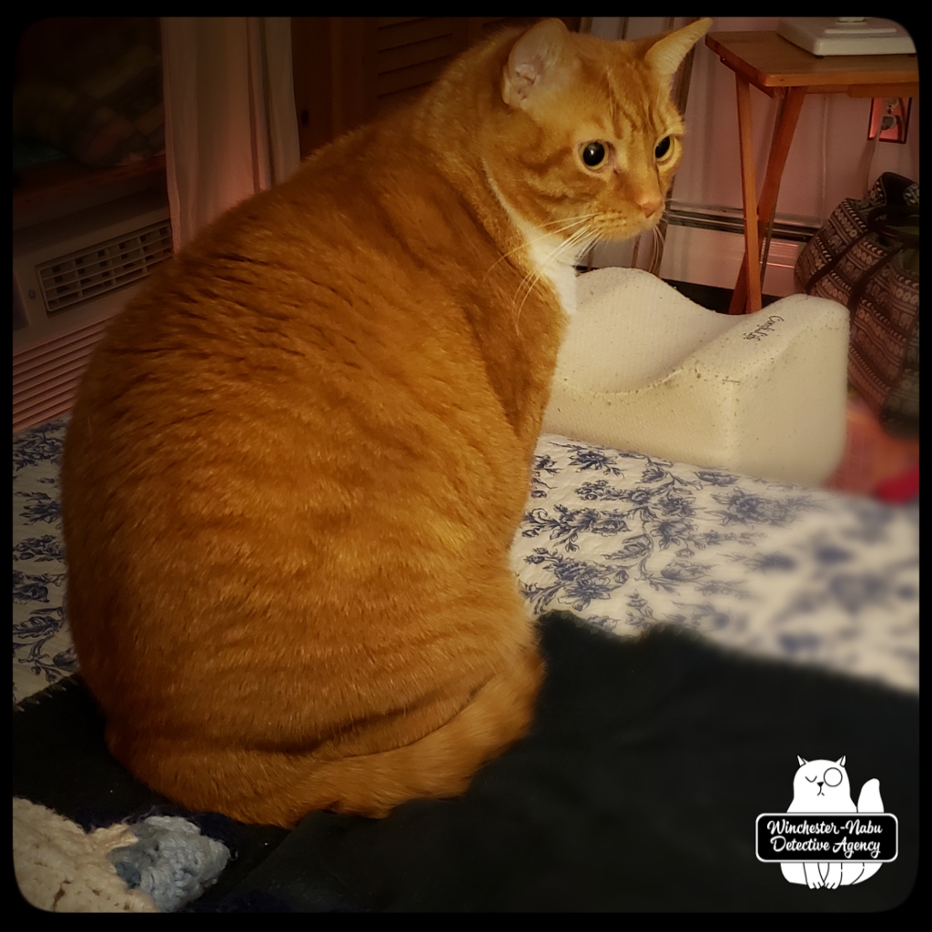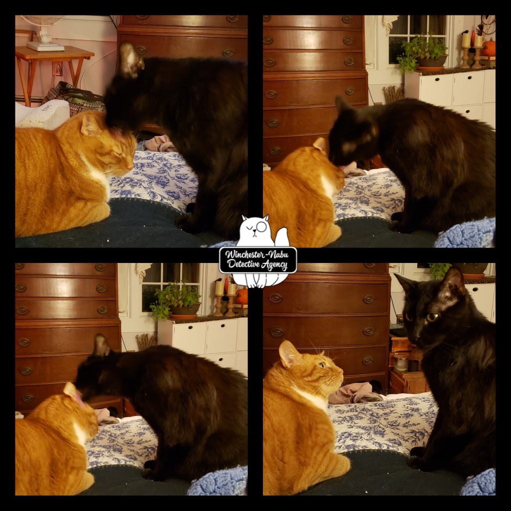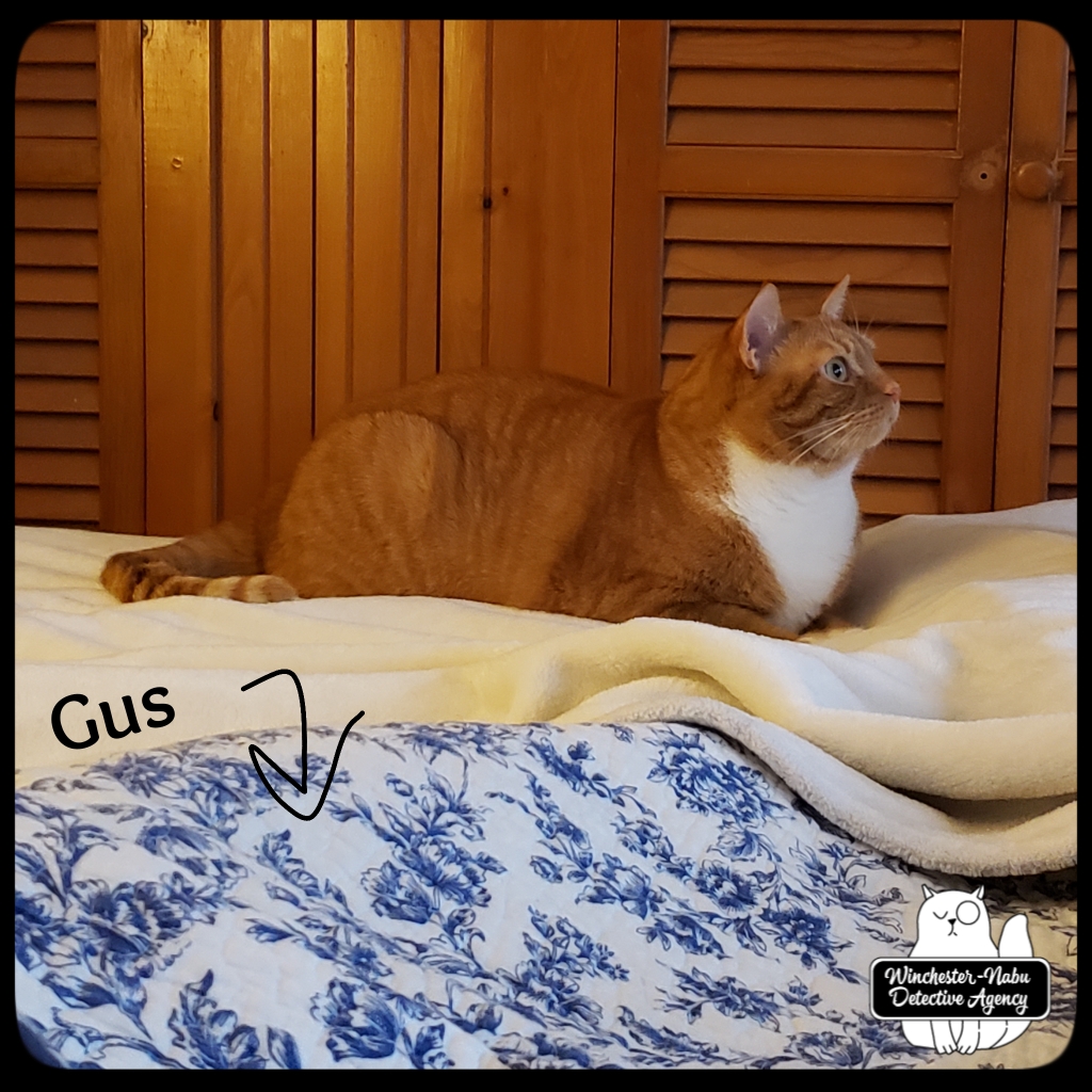 Burton Guster Nabu sharpened his claws to get ready. Oliver Winchester took the lead. Ollie would sit wherever he sensed activity — mundane or paranormal. Sometimes even my human ears could hear the squeaks and clawing. One incident was particularly weird: Gus and I were snuggling on the bed and heard loud squeaks and what sounded like a critter or two sliding down the wall raking claws along the way. It was oddly loud.