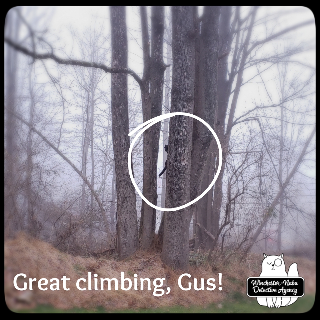 The brisk air outside makes Gus move around a lot more. He’s less likely to sit under the bird tree for an hour. He’ll give it a couple of minutes. We loop around the perimeter. When a breeze comes through, Gus will tear across the whole field while humans clench their butts hoping he doesn’t head for the road. He hasn’t so far. He either chooses a tree to quickly ascend or hooks to change direction and keep running. Then I have to try and catch up. He’s usually somewhere around the front border or Oliver’s patio.