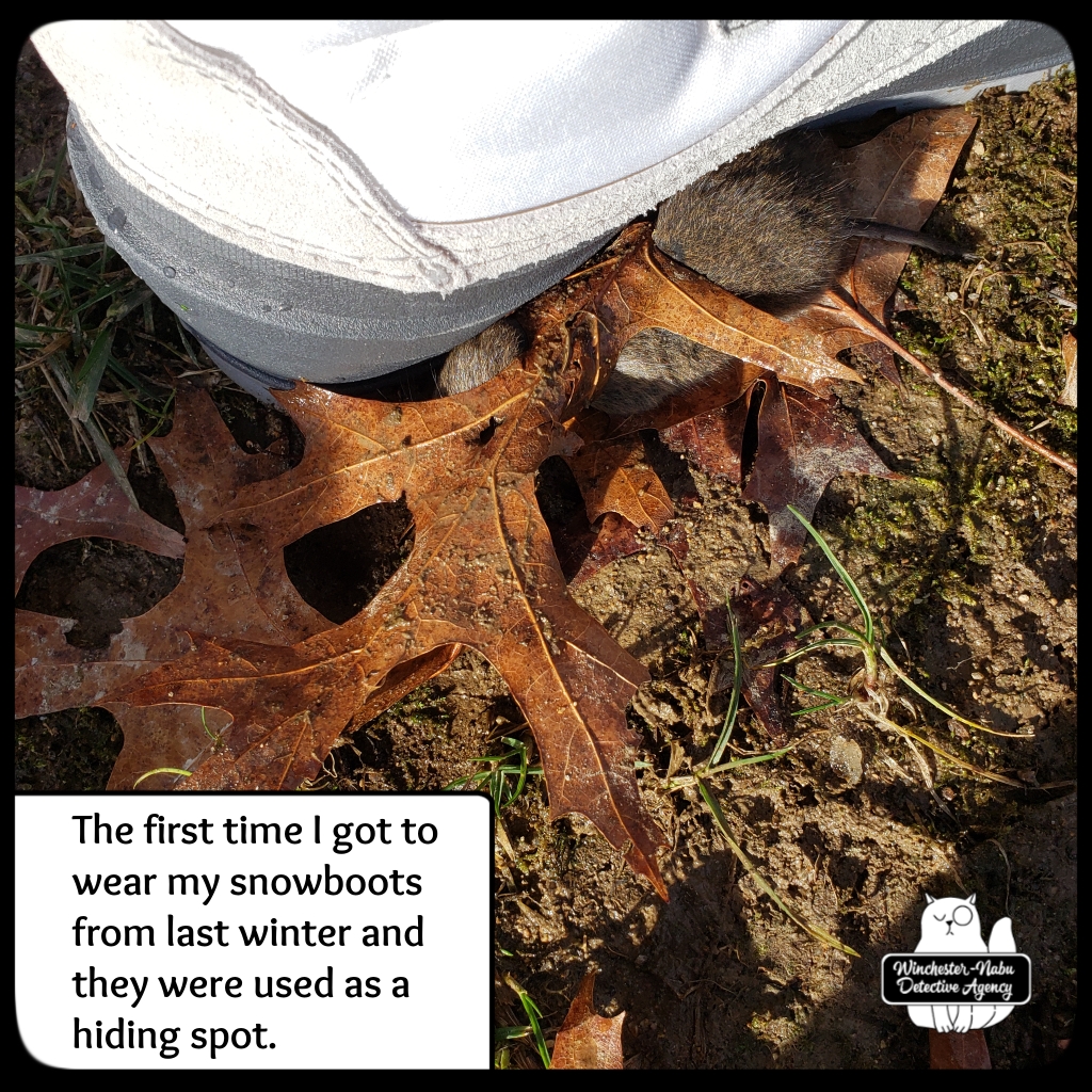 After I realized Gus did indeed break Jean’s back leg, which at first I thought was total back end paralysis, I didn’t want the critter to suffer. What are the odds of a rotund meadow vole surviving with a bum leg? I have no idea! But you know that moment when a fighter rousts all the strength they have left and gives it one more round? Jean did that! That vole was able to scurry across the snowy grass with a broken leg! Yet, it would stop, turn, and face Gus along the way.