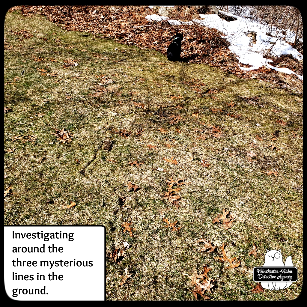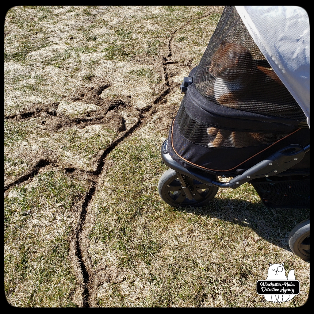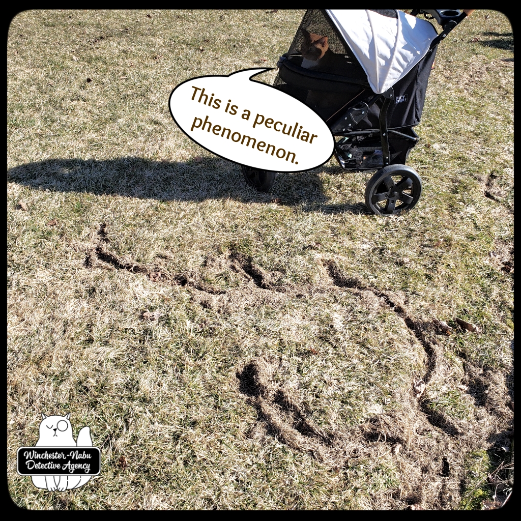 My eyes followed the strange cracks in the earth. I decided to take a step back and get a more distant view from above. There were three intersecting channels that reminded me of the Celtic symbol, triskelion or triskele. This meant that Gus and I had to take the photographic evidence back to the Winchester-Nabu offices to show Oliver who has only resumed outside observations on the balcony and has not been able to get buggy rides all winter. Oliver wasn’t going to have the opportunity to see the discovery for himself anytime soon.