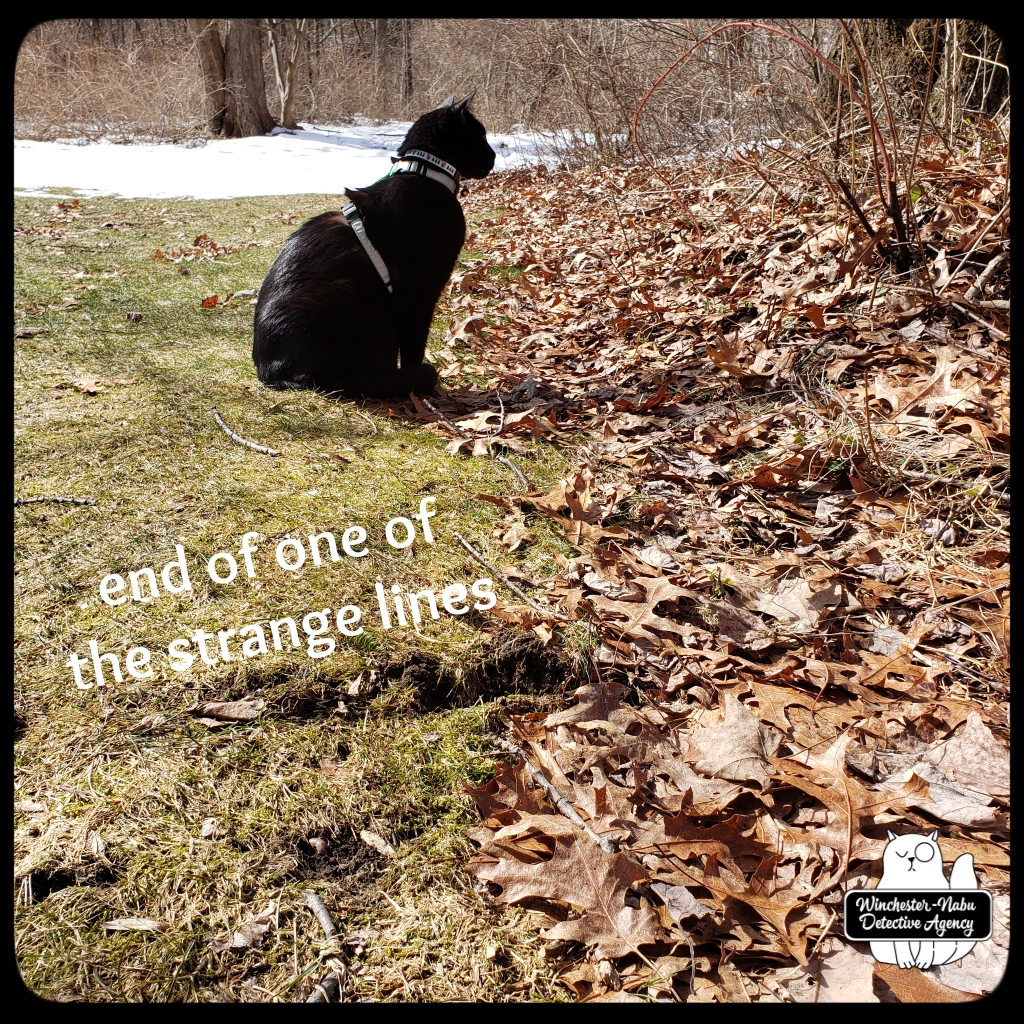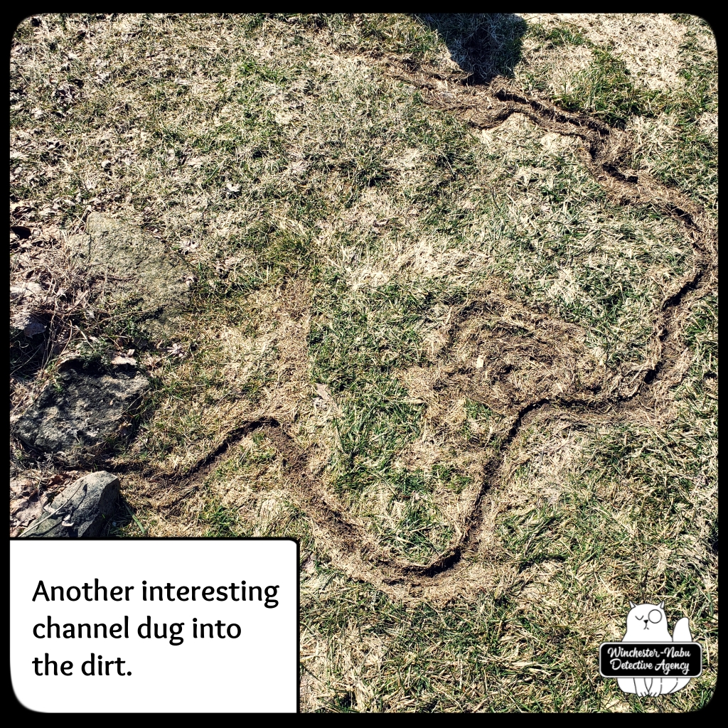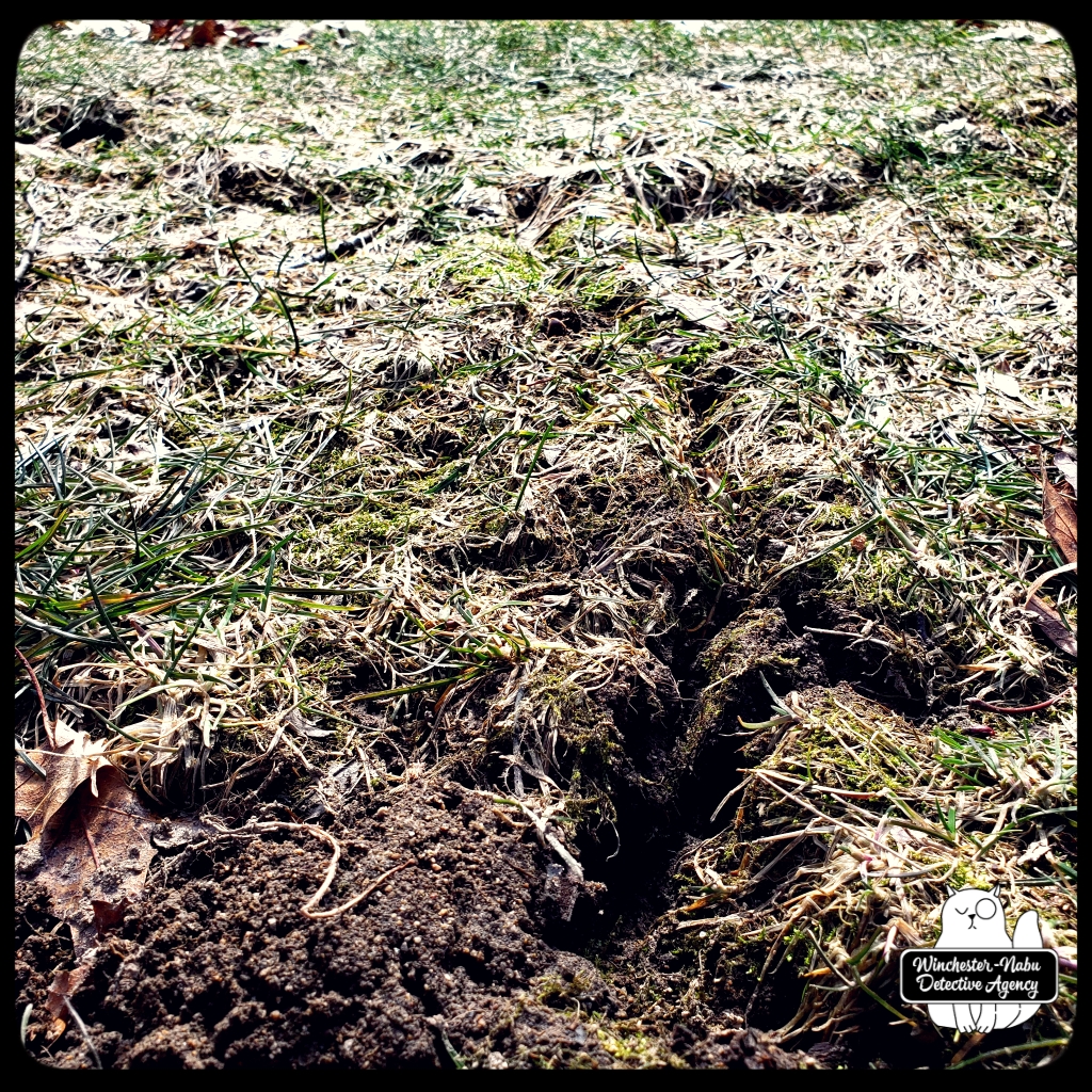 I kept looking down because the grass was a minefield of poo (see previous casefile). Not even exaggerating. Not even a little. There is so much scat. Pile after pile of devil-deer raisinette poops. That’s when I noticed the crevasse. Crevasse might be an exaggeration, but I guess that depends on how big you are. To a vole, mole, or mouse, what I discovered would be a series of crevasses. If you’d like go off on that tangent, Merriam-Webster has a fine page on crevice and crevasse usage.