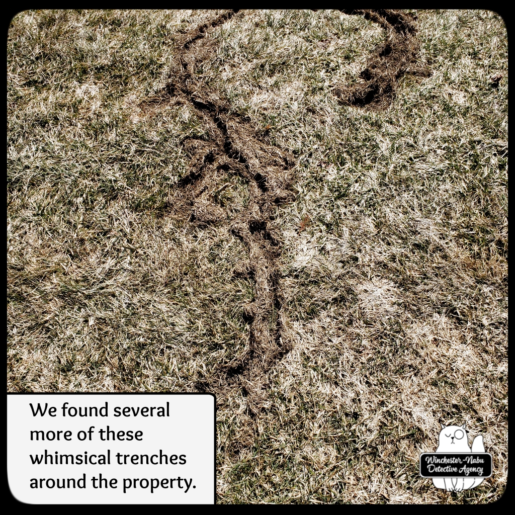We discovered miniature ditches in a three-branch design in the field behind Fort Winchester near the Fire Trail. We had to work with the Blue Jay Gang to get more information and learned that the crevasses were the result of a basilisk under the ground. The monster was repelled successfully with an ultrasonic device.