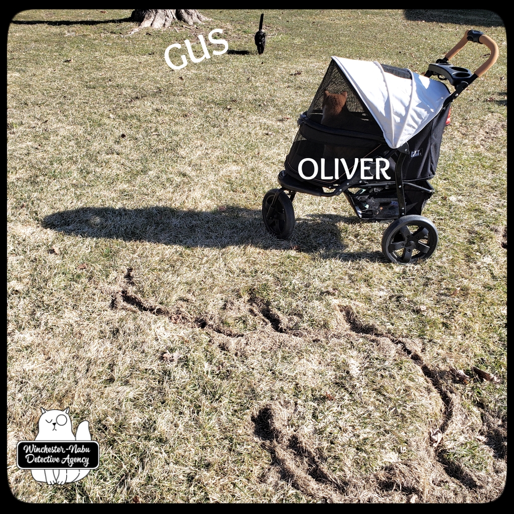We had to skip adventures for a couple days due to the unbearable wind. In lieu of exploring the great outdoors, a platter of seeds was put on top of an ornamental column on the front porch. The birds and a squirrel friend appreciated it. Oliver and Gus sat inside chattering and howling loud enough for the birds to hear. Johnny was not going to show up without peanuts. Talking to the smaller birds through windows was not going to get us results. Once the weather allowed Gus and I to get back outside, we took advantage of it. The patrol was short so we kept focused on the mission.