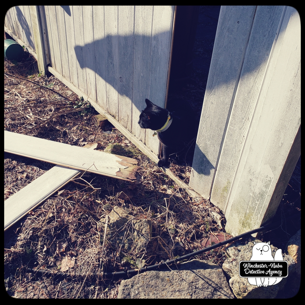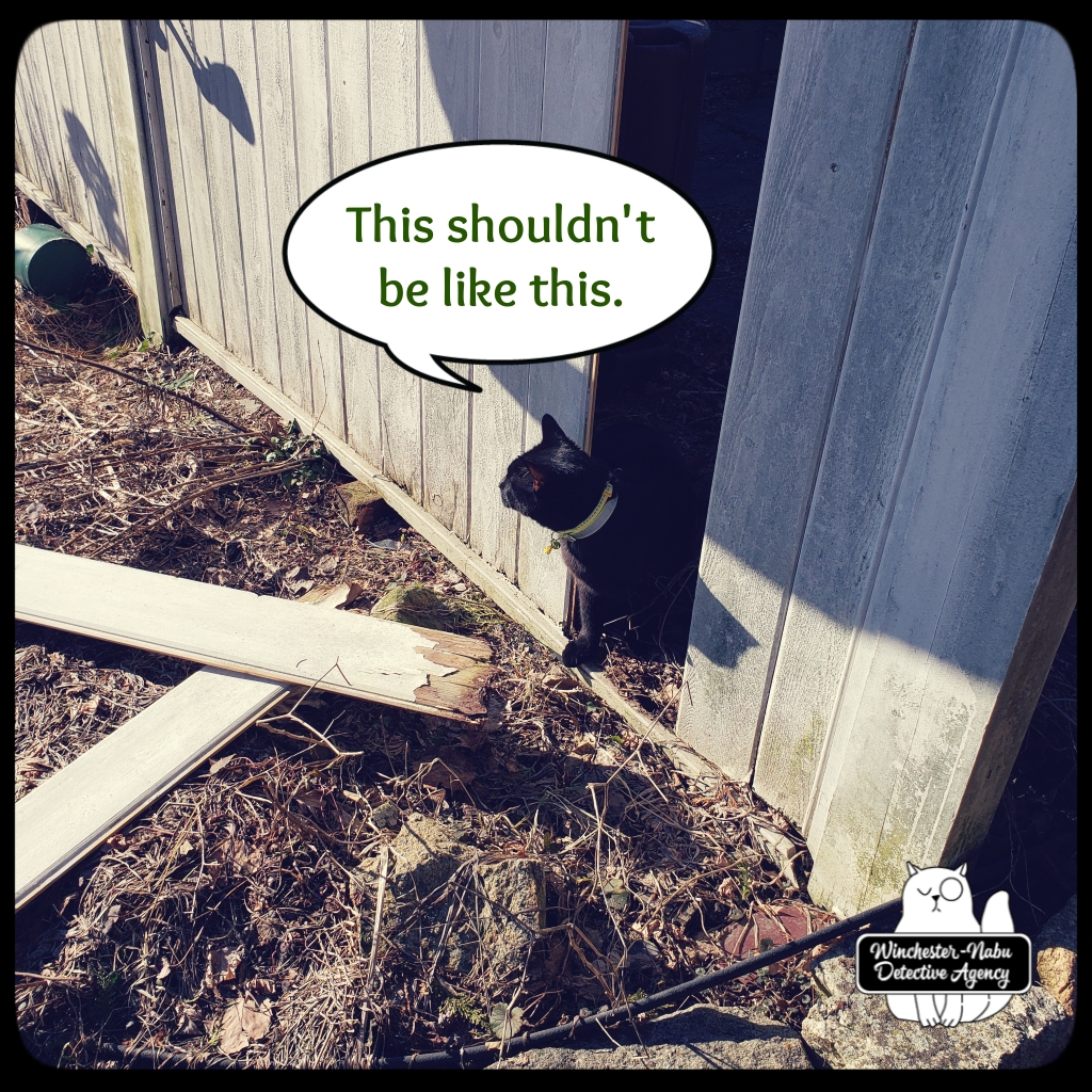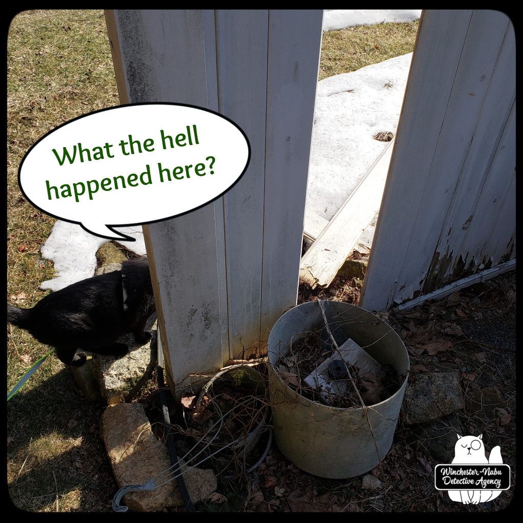 As previously noted in our case files, we also discovered many piles of poop. It was all over the place — as were tons of branches of all sizes. We stumbled up an area bordering Oliver’s patio, that was damaged. Part of the fence previously warped was now on the ground. Our new case presented itself: was the fence damaged by storms or did someone/something break down the fence?