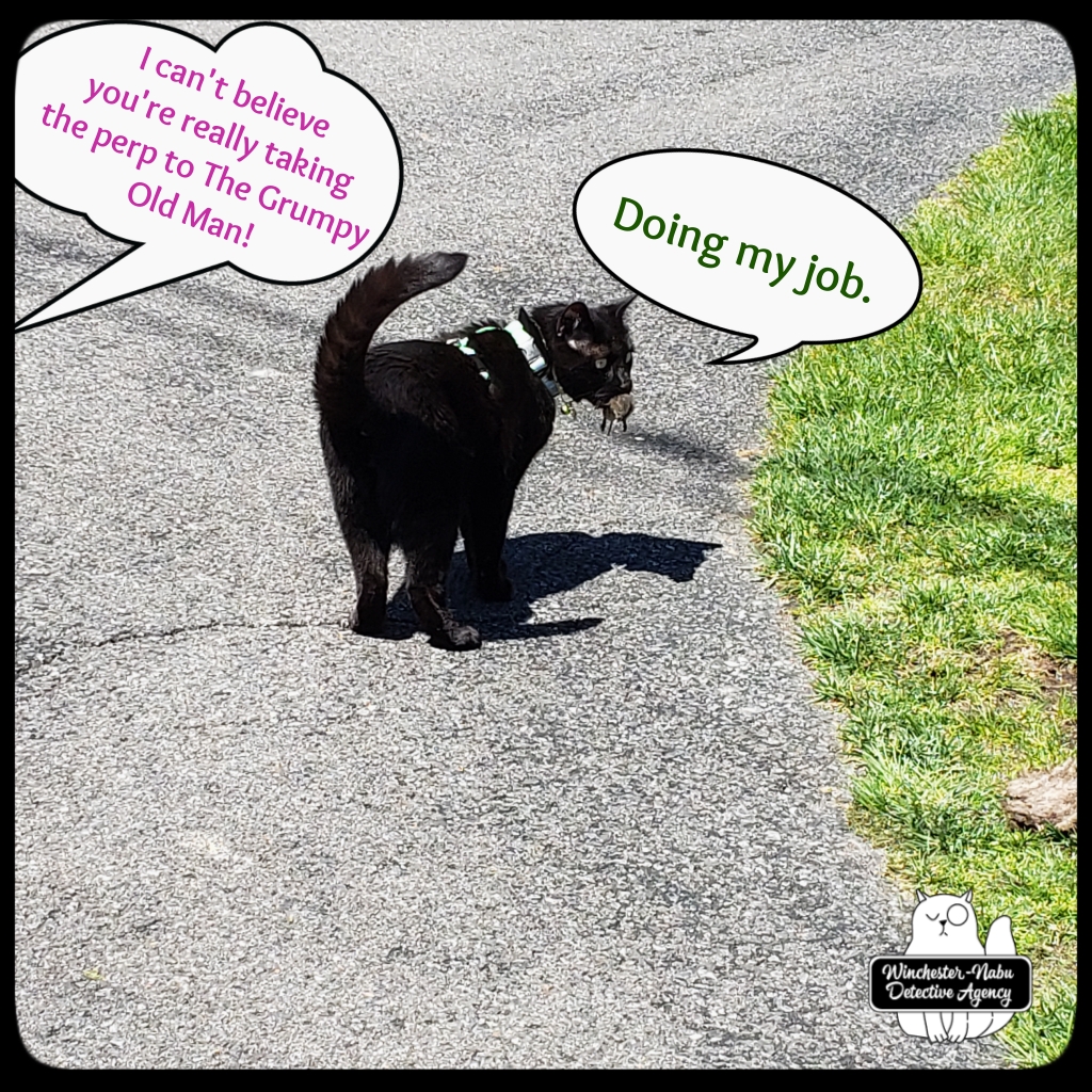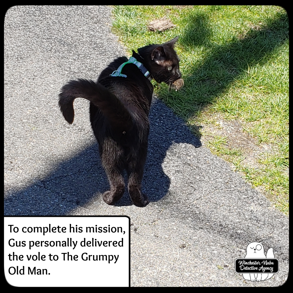 Gus made a couple of attempts to pounce over the edge of the shrubs and dive into them, coming up empty. Eventually he caught his perp and wanted to celebrate. Instead of bringing it home, since Vole Custer’s capture Gus has decided that he should “escort” the perps up to the hangar to present to the Grumpy Old Man.