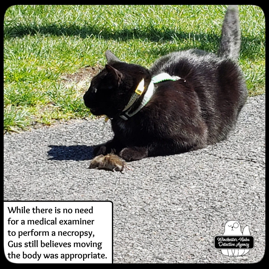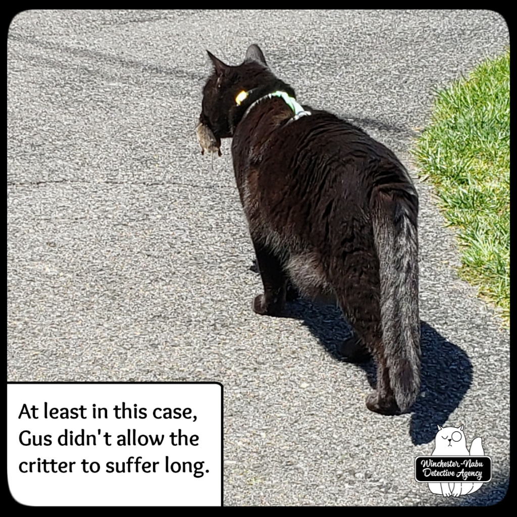 It’s been a few months since Gus got the formal directive from The Grumpy Old Man to kill all the mice, voles, and moles. The human doesn’t appreciate that the mice are nesting all over the residence, garage, and workshop areas; and the voles and moles are digging up the backyard. If he thought Gus could win in a fight against groundhogs, they would be added to be added to the murder list.