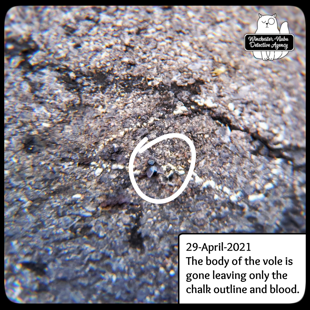 When I returned to Gus, he picked up the body and moved it a few more feet. The new location would have to serve as my starting point. We were on the corner of the upper parking lot and the private road. I set up the designation for the scene as a crime even though I know Gus had just extinguished the life from the meadow vole. However, the mystery is who is Vole Avery and what happened to his body?