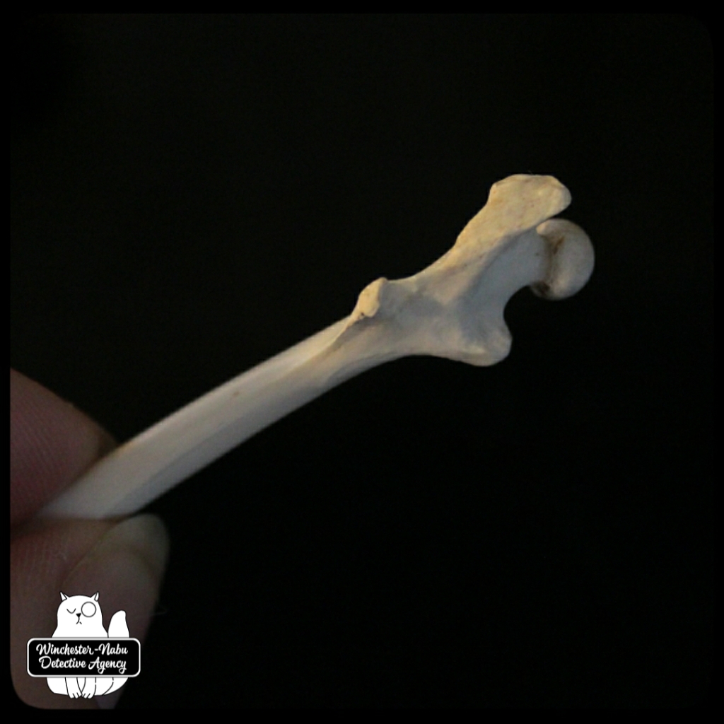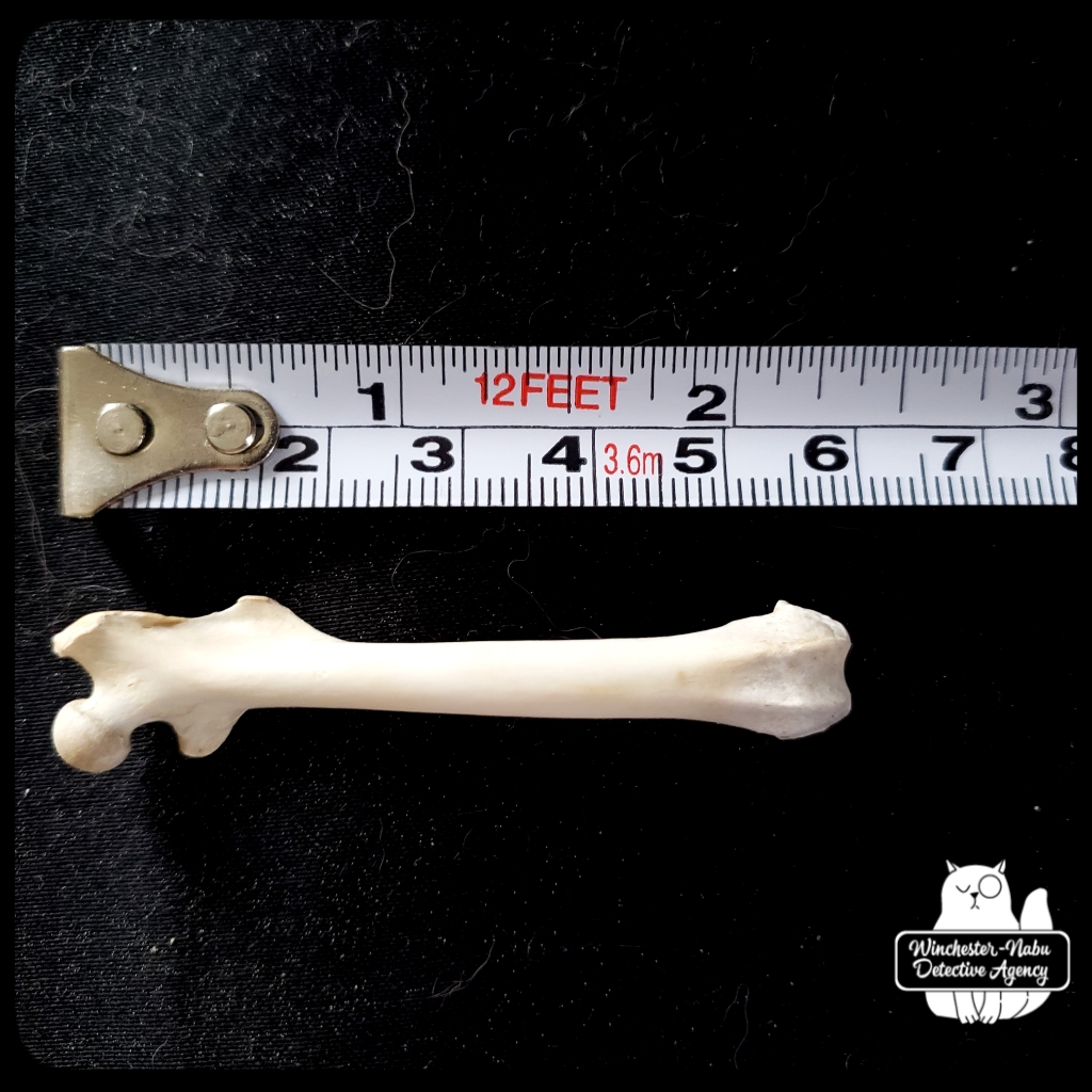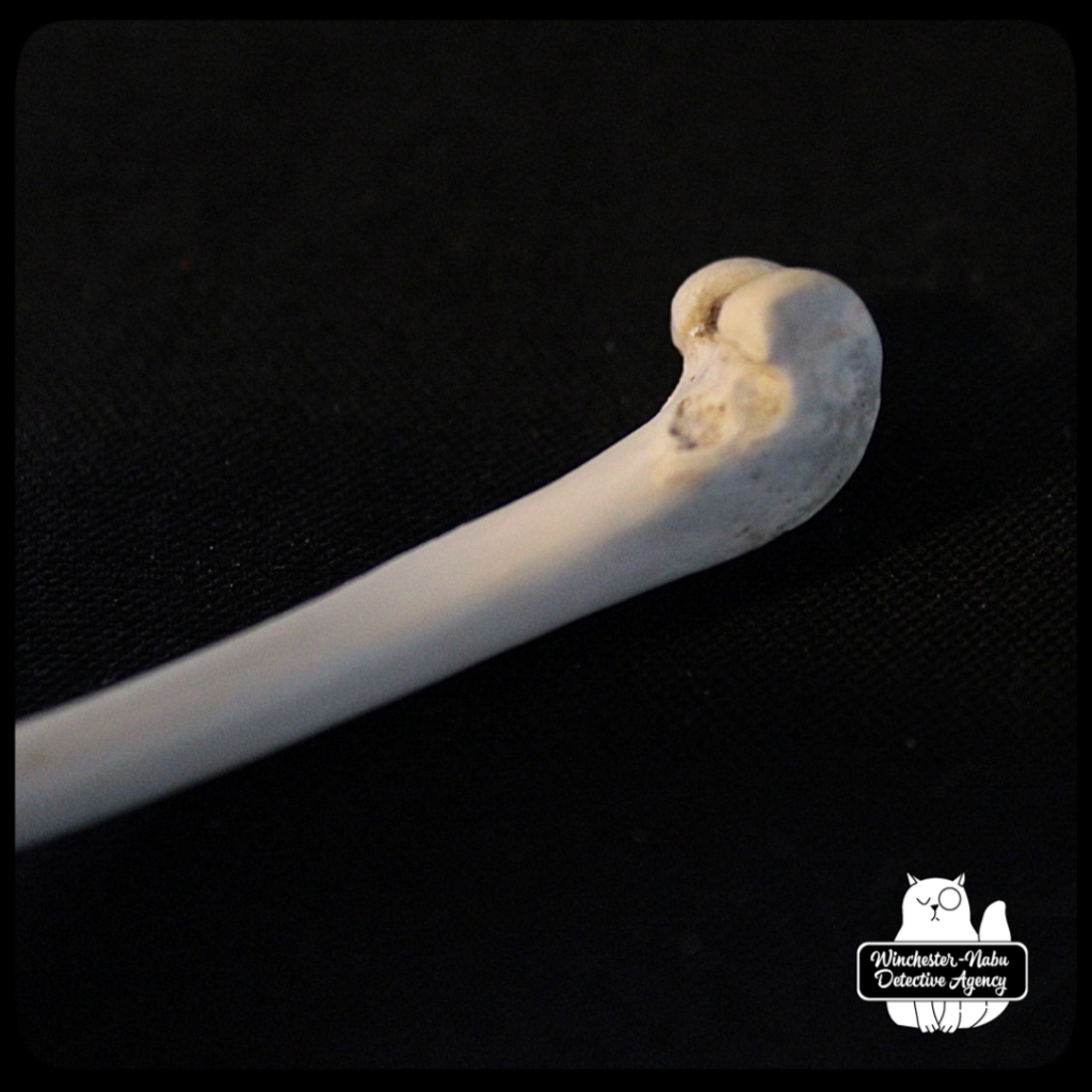 The first thing I noticed about the femur was that it was quite clean and in one piece. I’ll admit it’s getting significantly harder for my eyes to see intricate details without the use of a zoom lens or magnifying glass. I even use the camera zoom on my phone to read descriptions of TV shows now (hashtag old). I couldn’t wait to get it home to clean up and show Oliver Winchester for his input.
