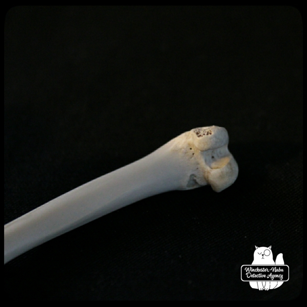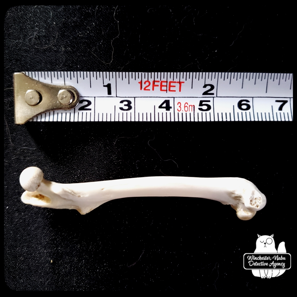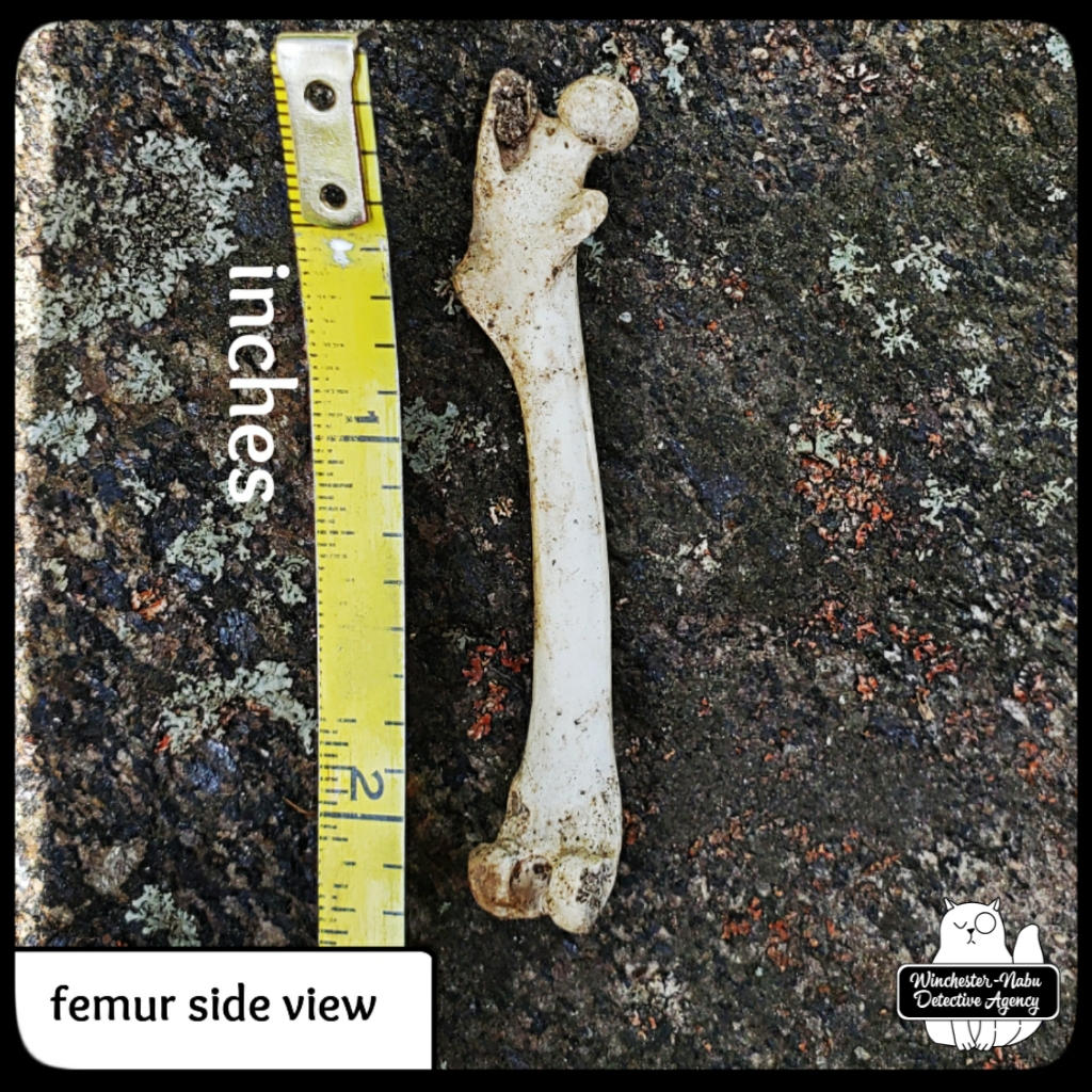 The first thing I noticed about the femur was that it was quite clean and in one piece. I’ll admit it’s getting significantly harder for my eyes to see intricate details without the use of a zoom lens or magnifying glass. I even use the camera zoom on my phone to read descriptions of TV shows now (hashtag old). I couldn’t wait to get it home to clean up and show Oliver Winchester for his input.