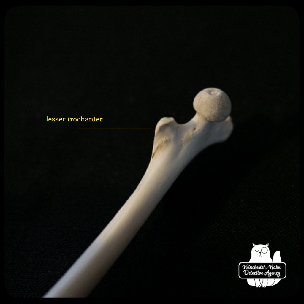Under close scrutiny, this bone is not showing any of the signs that carcasses had like visible teeth marks and scraping lines from gnawing. There are marks that stand out near on the lesser trochanter. This is the protuberance below the bulbous head. The lesser trochanter is an important attachment point for muscles that connect the pelvis to the legs. I had to conclude that markings in that spot were natural as were all of the other parts that weren’t smooth. The smooth layer of bone is compact bone. You’ll see in the photos of the distal end (the part that makes up a third of the knee) that some of the bone looks spongy.