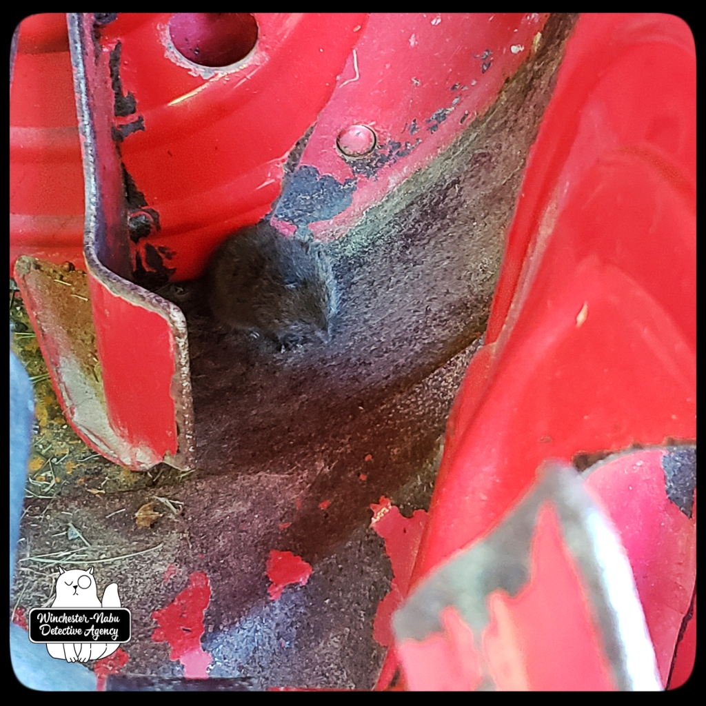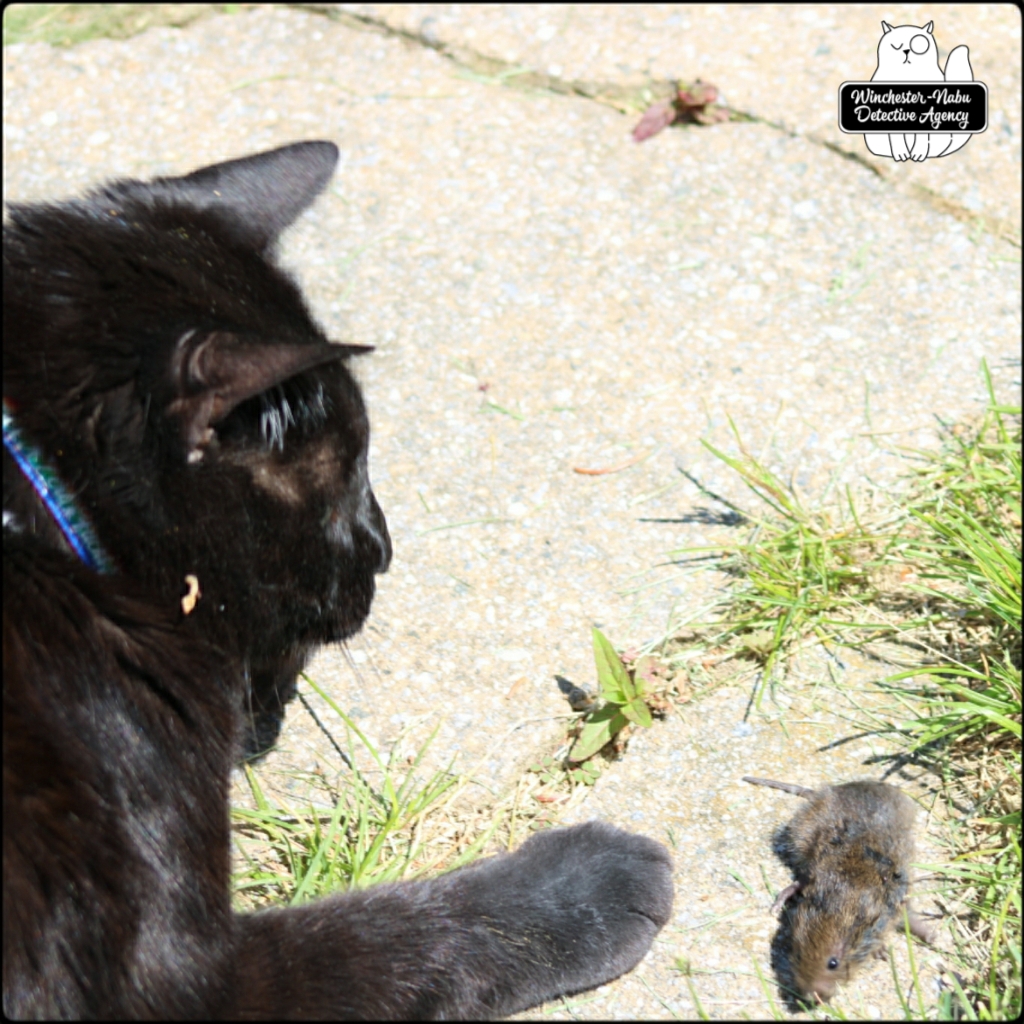 In the middle of May, Gus was on a hot streak of capturing meadow voles per The Grumpy Old Man’s request. On a particularly sunny day, Gus was superbly efficient. He had a new perp in custody within seconds of being out the hobbit door. Like many of the voles, this one claimed to be in show biz, specifically a musical performer named Paula Vole.