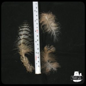 When Gus and I went the following morning, that’s when he found some evidence. I was able to collect three feathers with markings in brown, white, and black. There were white spots on one of the smaller feathers at the end; the largest one had dark stripes. We’ve collected only a few feathers like this in all our years of adventures and research. They always come back as a Great Horned Owl when uploaded to the database.