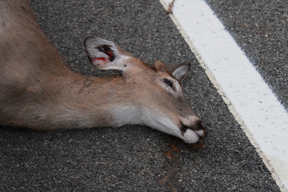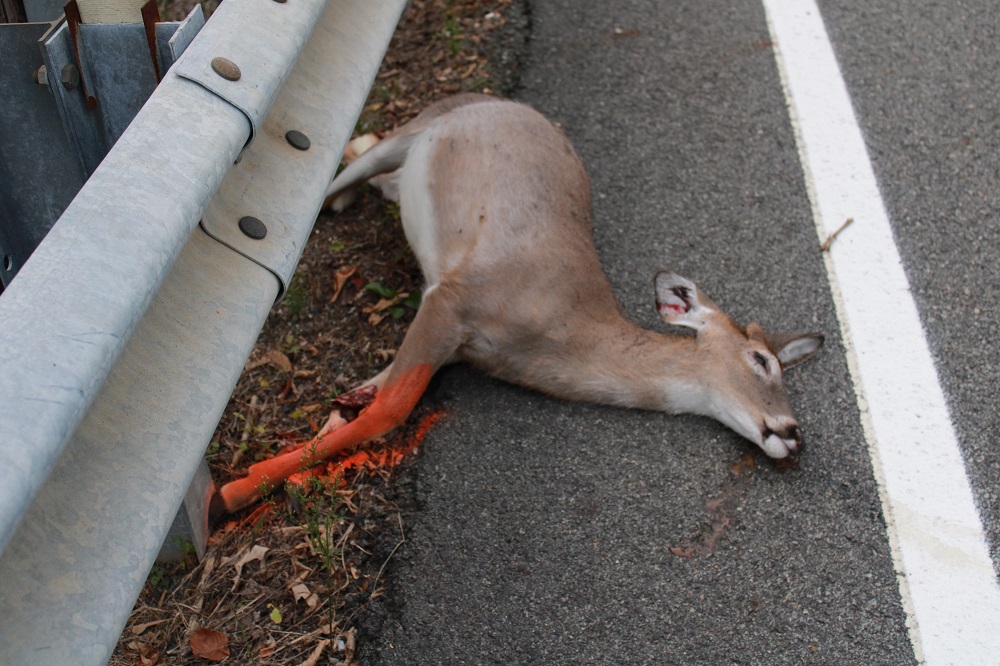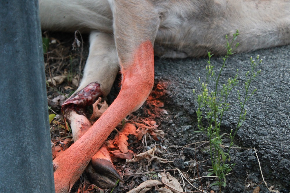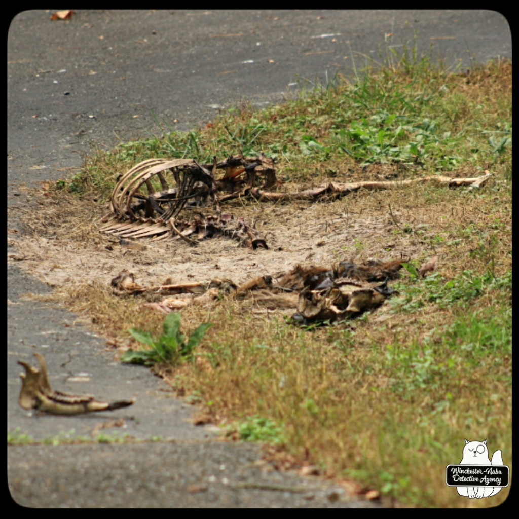 More inspection during the relocation allowed us to determine that this was not a vehicular hit and run either. There were no fractured bones of all the bones we collected. In a strange coincidence, I got to examine and photograph another beast not far from our crime scene; a victim clearly hit by a vehicle with broken leg (the orange spray paint indicates it was reported and will be cleaned up by a crew). What’s notable in these photos is that the hit and run victim does not have the “exploding ass” as seen with our victim.