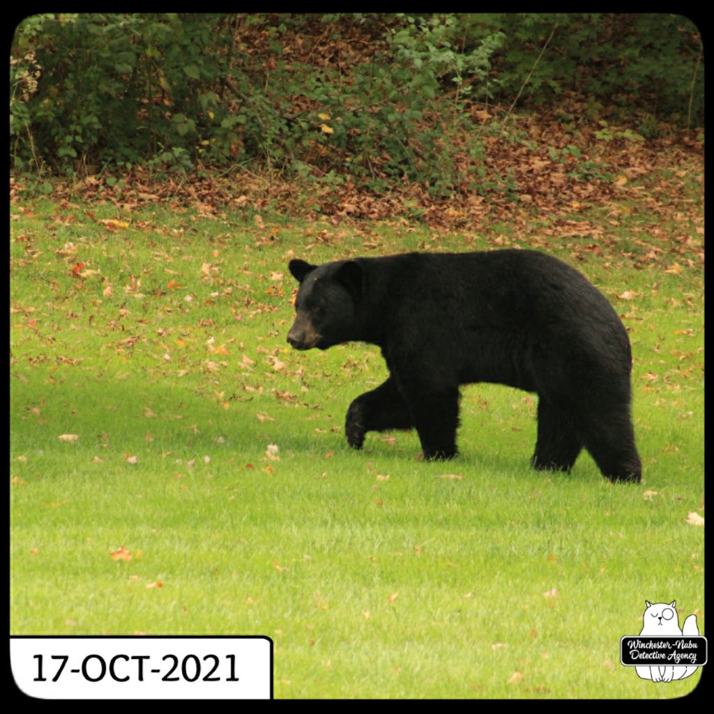 A couple of months ago in Case File No. 18-226, we were able to get some excellent observations of male volkolaks in bear form as they walked through the property. In mid-October, another one came through by itself. Based solely on our eyewitness accounts, this October beast seemed slightly smaller than Silly to the naked eye which has us believing it was Val, his sister. This brings up a couple questions: What was she doing here by herself? Does a closer inspection of the bears in comparison photos mean it’s one volkolak perp and not two?