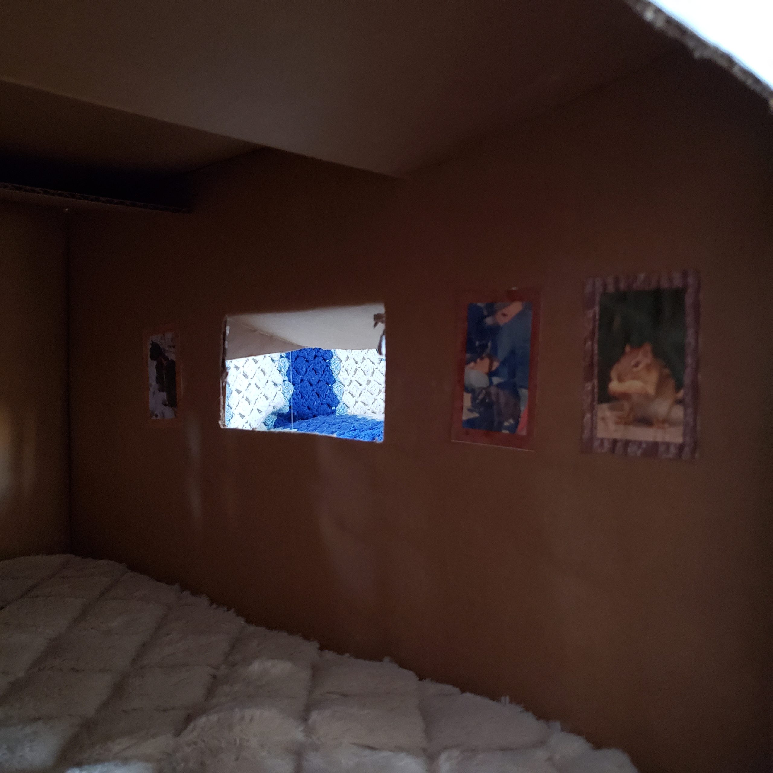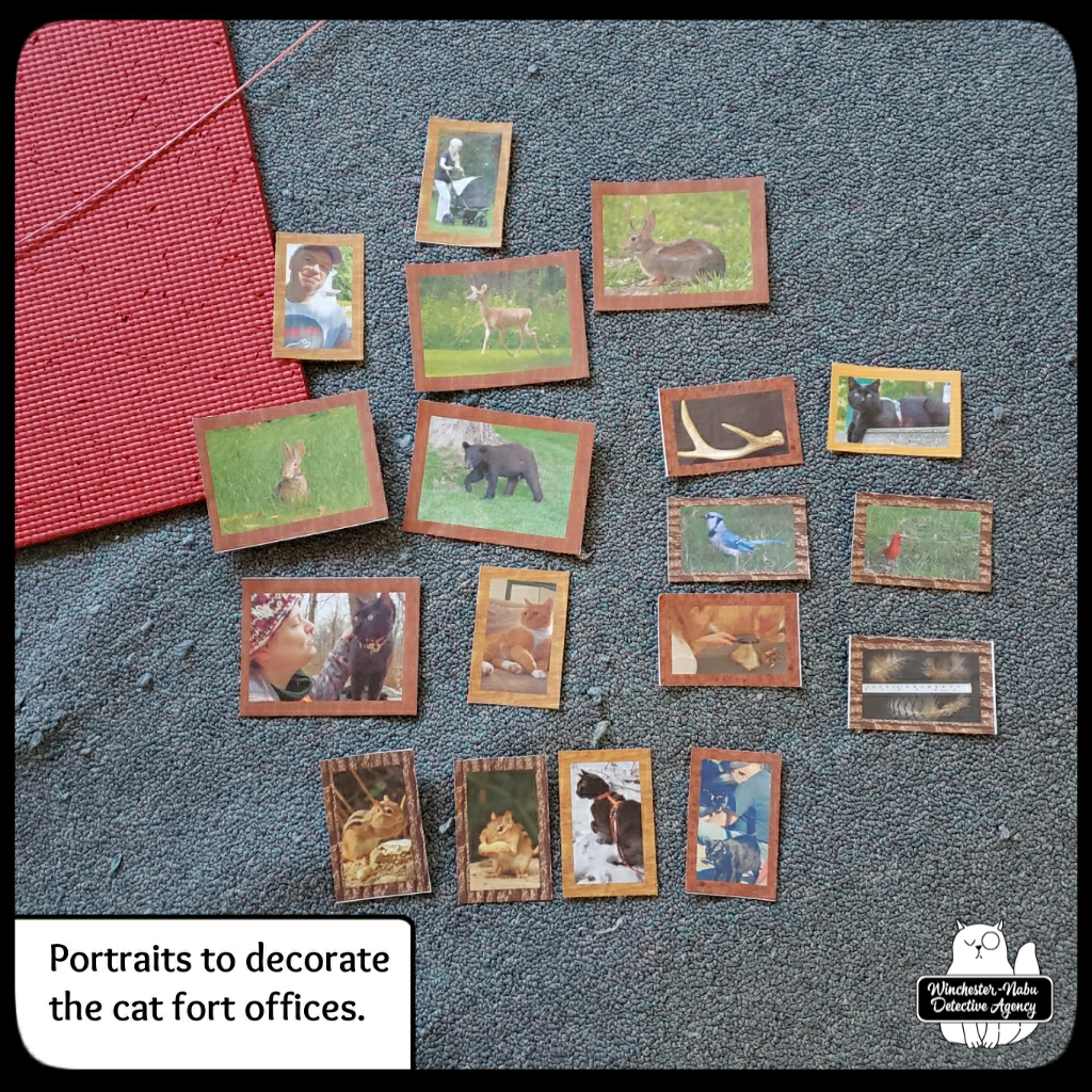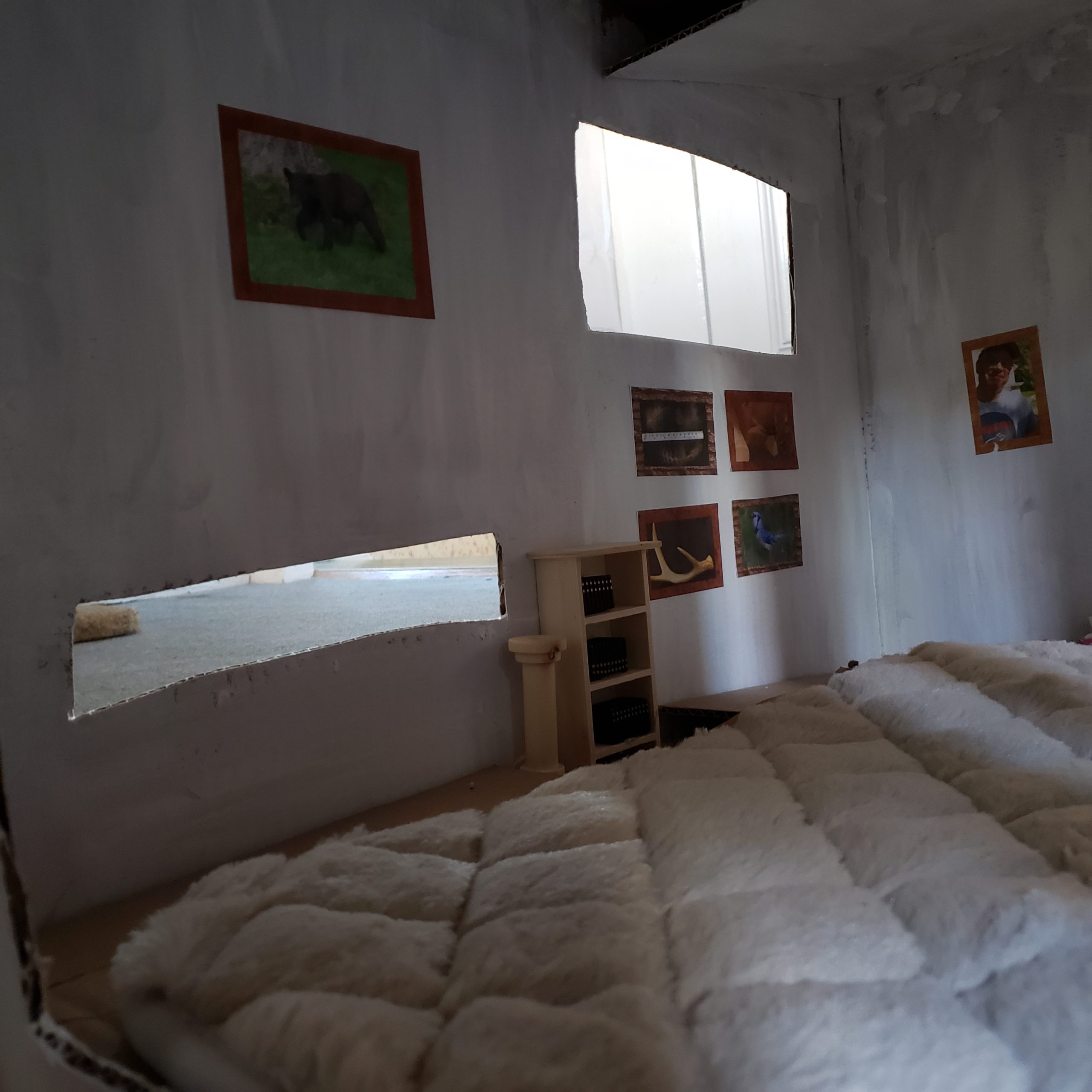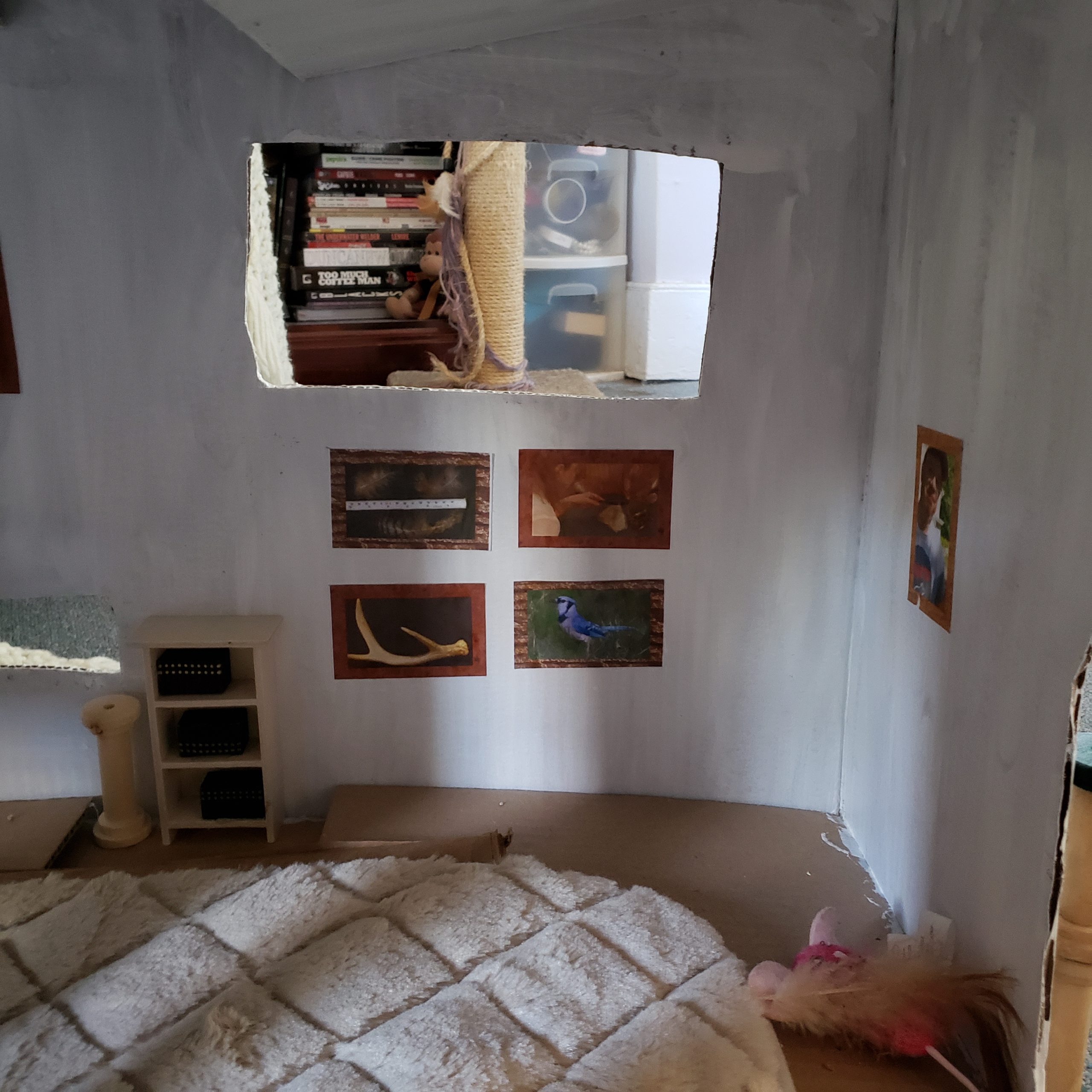 Portraits of the cats, the humans, and some of our wildlife adventures were printed and hung. This was harder than you might think. Since all the box flaps had been glued and taped, I had to reach through the doors and small windows trying to get the portraits hung. A few are crooked. Most recently I added what was a terrarium but I had killed the plant so I replaced the plant with some of the bones we’ve collected.